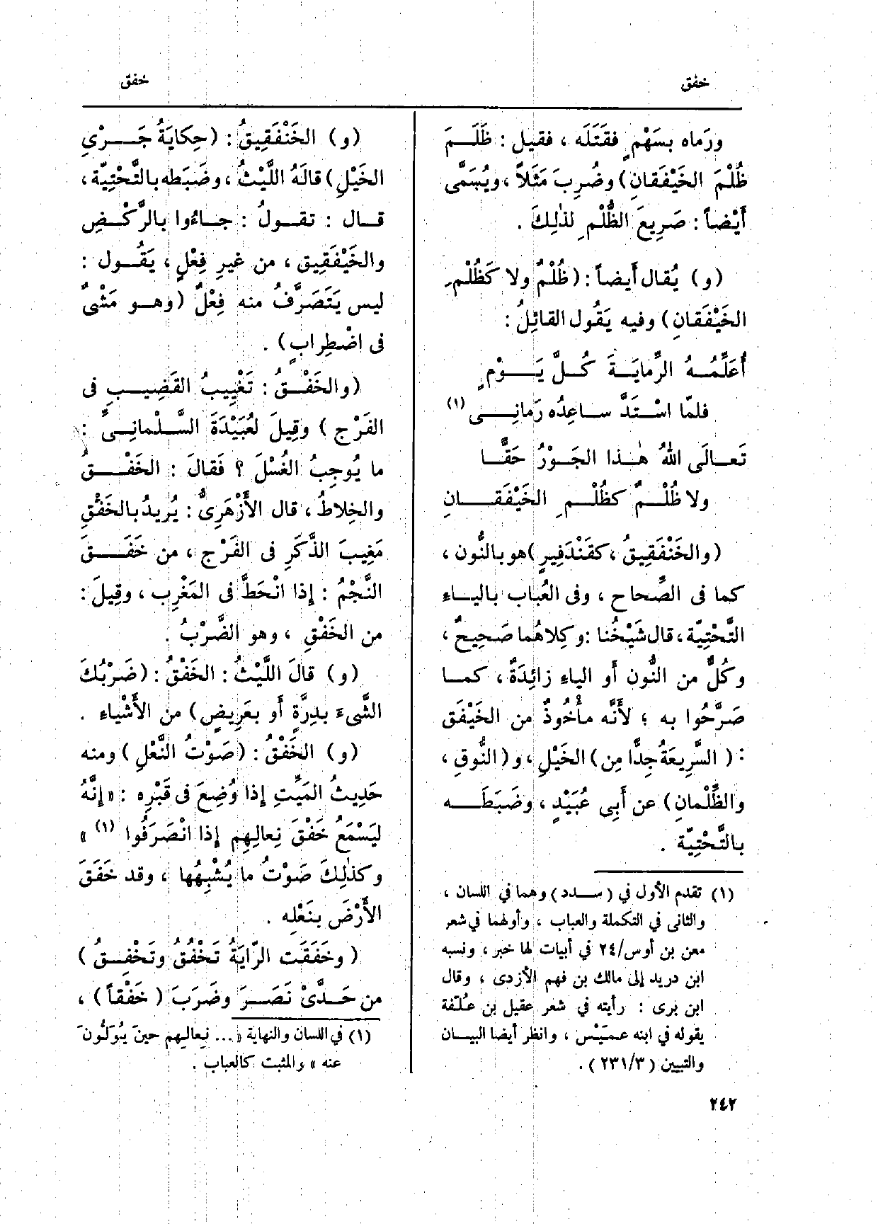 والخَنْفَقِيقُ، كقَنْدَفِيرٍ هُوَ بالنُّون، كَمَا فِي الصِّحاح، وَفِي العُباب بالياءَ التحْتِيّة، قَالَ شَيْخُنا: وكِلاهُما صَحِيح، وكُل من النُّون أَو الياءَ زائِدَةٌ، كَمَا صَرَّحوا بِهِ لأنَّه مأخوذٌ من الخَيْفَق: السَّرِيعَةُ جِدُّا مِن الخَيْل، والنُّوقِ، والظِّلْمانِ عَن أبِي عُبَيْدٍ، وضَبَطَه بالتحْتيّة.