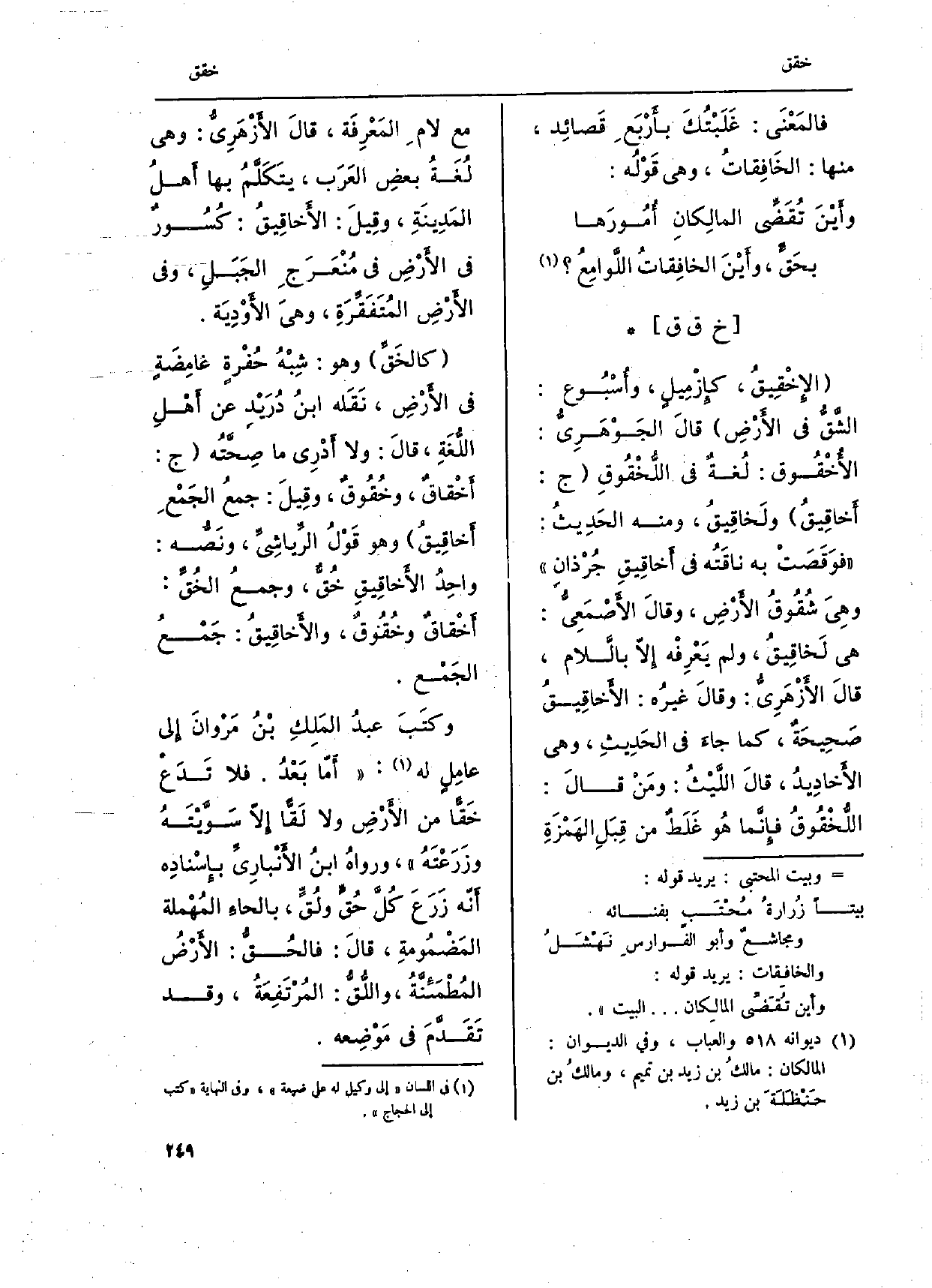 وكتَبَ عبدُ المَلِكِ بْنُ مَرْوانَ إِلَى عامِلٍ لَهُ: أمّا بَعْدُ. فَلَا تَدَعْ} خَقاً من الأَرْضِ وَلَا لَقاً إِلاّ سَوَّيْتَهُ وزَرَعْتَهُ، ورواهُ ابنُ الأنْبارِيِّ بإسْنادِه أَنّه زَرَعَ كُلَّ حُقِّ ولُقٍّ، بالحاءَ المُهْملة المَضْمُومةِ، قالَ: فالحُق: الأرْضُ المُطْمَئَنَّةُ، واللُّقُّ: المُرْتَفِعَةُ، وَقد تَقَدَّمَ فِي مَوْضِعه.