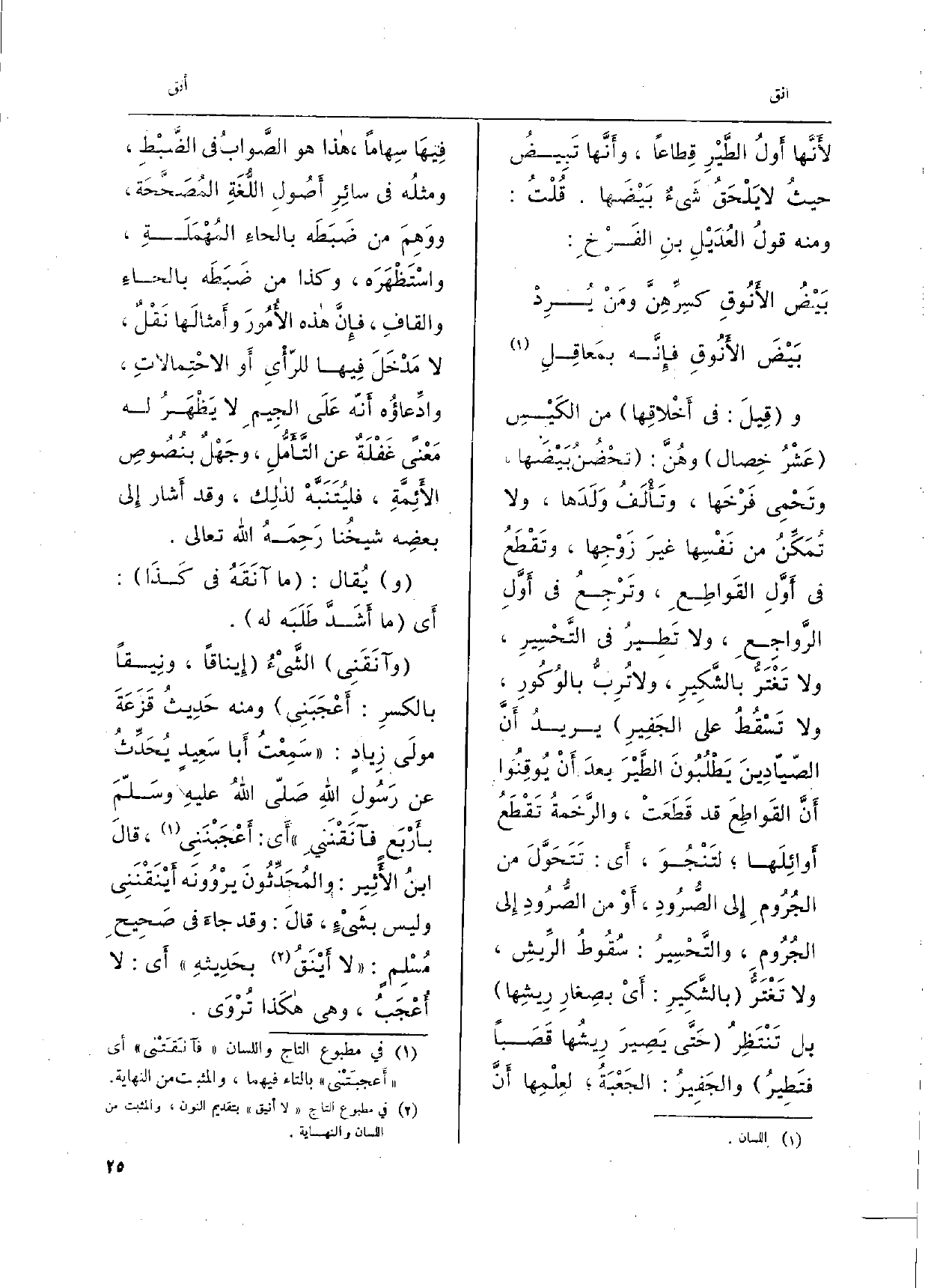 وقِيلَ: فِي أخلاقها من الكَيس عشْرُ خِصال وهنَّ: تحضن بيضها وتحمي فَرْخَها، وتَألَفُ وَلَدَها، وَلَا تمكن من نَفسهَا غير زَوجهَا وتقطع فِي أَوَّلِ القواطع، وَترجع فِي أول الرواجع وَلَا تطير فِي التحسير وَلَا تغتر بالشكير وَلَا ترب بالوكور. وَلَا تسْقط على الجفير يُرِيد أَن الصيادين يطْلبُونَ الطير بعد أَن يوقنوا أَن القواطع قد قطعت والرخمة تقطع أوائلها لتنجو، أَي تتحول من الجروم إِلَى الصرود أَو من الصرود إِلَى الجروم والتحسير سُقُوط الريش وَلَا تغتر بالشكير أَي صغَار ريشها، بل ينْتَظر حَتَّى يصير ريشها قصباً فتطير والجفير الجعبة لعلمها أَن فِيهَا سِهاماً، هَذَا هُوَ الصَّوَاب فِي الضَّبْط، مثله فِي سائِرِ أصُول اللغَةِ المصححة وَوهم من ضَبطه بِالْحَاء وَالْقَاف فَإِن هَذِه الْأُمُور وأمثالها نقل لَا مَدْخَلَ فِيها للرأْي أَو الِاحْتِمَالَات وادِّعاؤُه أَنه علَى الْجِيم لَا يظْهر لَهُ معنى غَفلَة عَن التَّأَمُّل، وجَهل بنصوص الأَئِمَّة، فليُتنَبَّهْ لذَلِك، وَقد أَشار إِلَى بعضه شيخُنا رَحِمه الله تَعَالَى وَيُقَال: مَا {آنقه فِي كَذَا أَي مَا أَشد طَلَبَه لَهُ.} - وآنَقَني الشَّيْء {إِيناقاً،} ونيقاً بالكسرِ: أَعجَبَنِي وَمِنْه حَدِيث قزّعة مولَى زِيادِ: سَمِعت أَبا سعِيدٍ يحَدَث عَن رَسُولِ الله صَلىّ اللهُ عليهِ وَسلم بأَربع {فآنَقننيَ أَي: أَعْجَبْني، قَالَ ابْن الأَثِير: والمحَدَثونَ يَرْوُونَهُ} أينقنني وَلَيْسَ بشَيء، قالَ: وَقد جَاءَ فِي صحِيح مُسْلِمً. لَا! أَيْنَقُ بحدِيثهِ أَي: أعجَبُ، وَهِي هكَذا تُروَى.