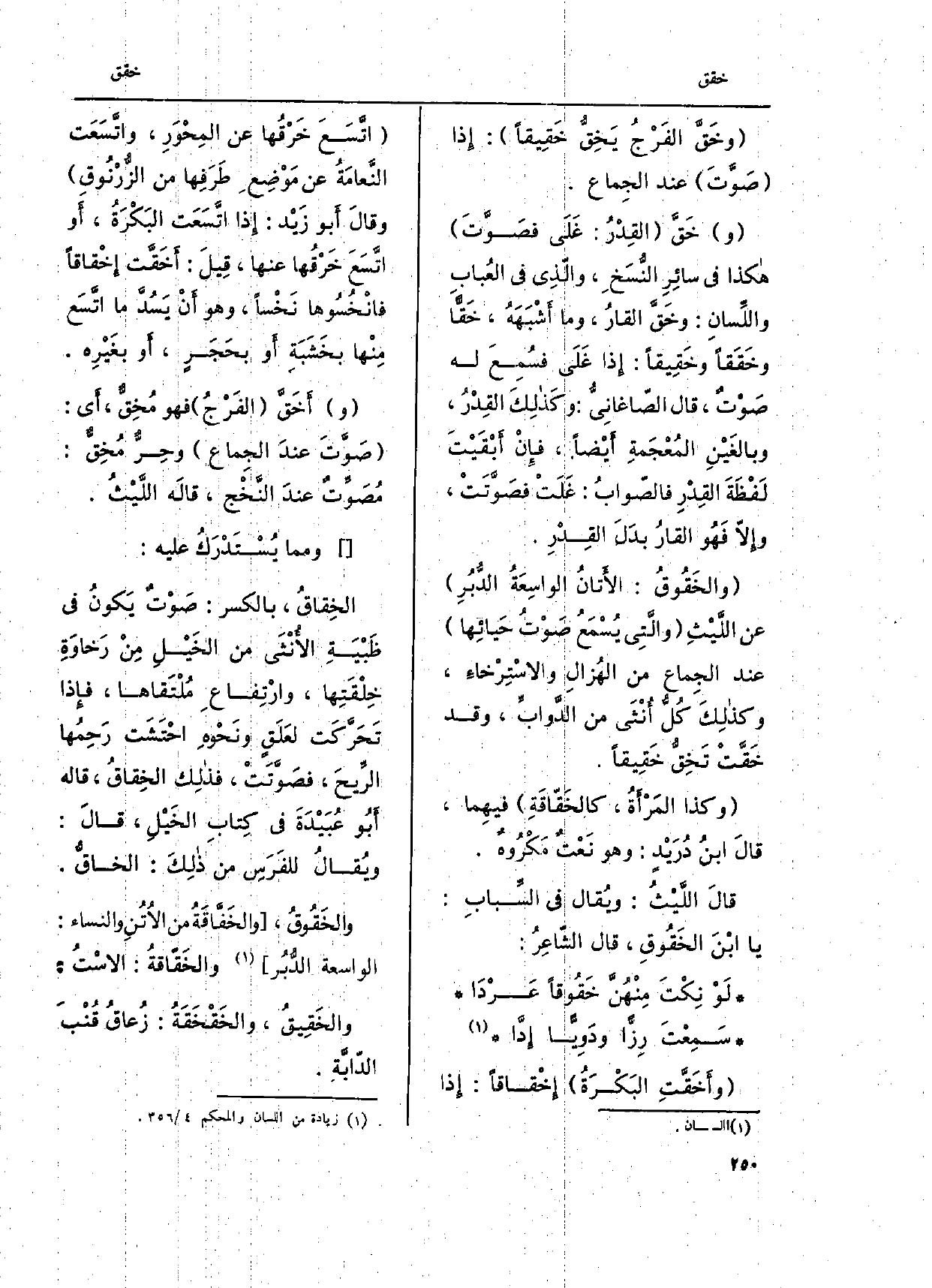 {والخَقُوقُ. الأَتان الواسِعَةُ الدُّبُرِ عَن اللَّيْثِ والَّتِي يُسمَعُ صَوْتُ حَيائِها عِنْد الجِماع من الهُزالِ والاسْتِرْخاءَ، وكذلكَ كل أُنْثَى من الدَّوابِّ، وَقد} خَقَّتْ {تَخِق} خَقِيقاً.)