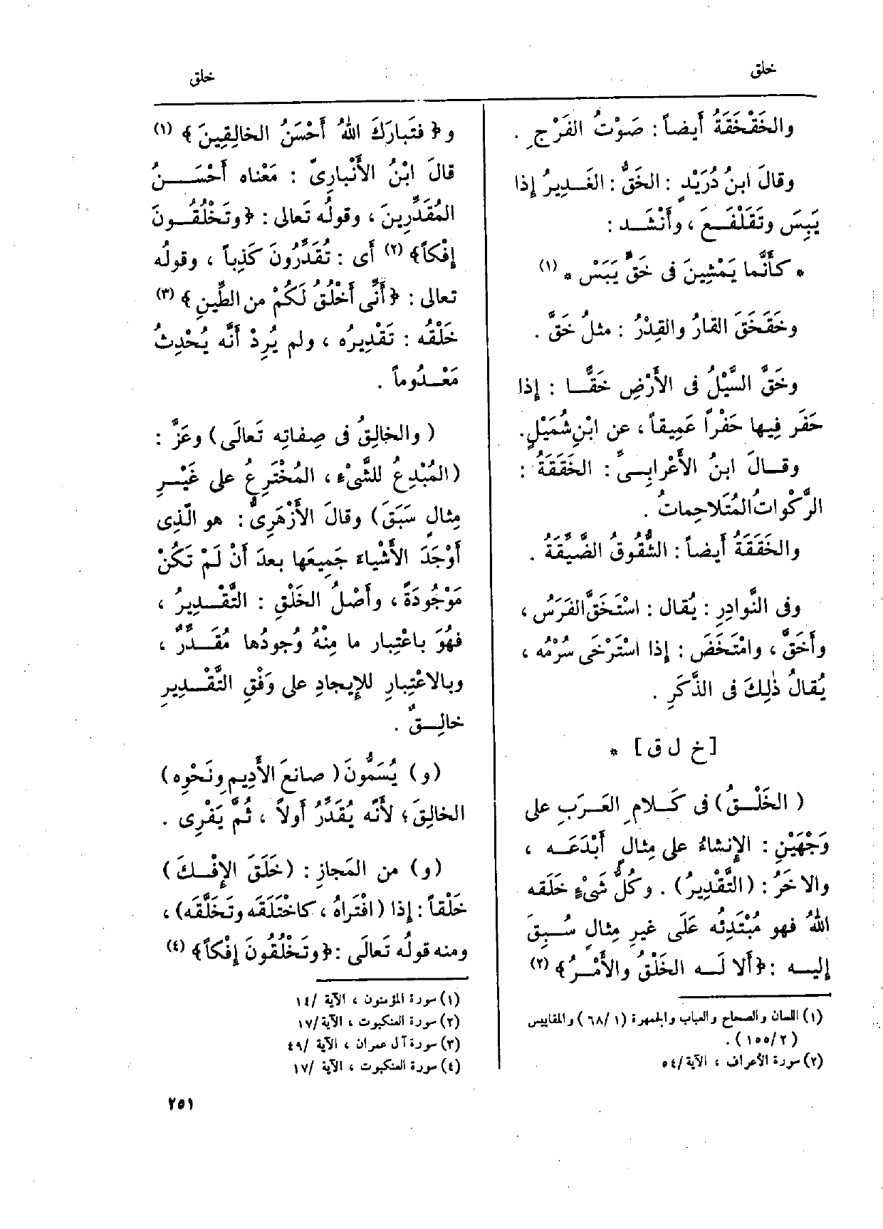 الخَلْقُ فى كَلام العَرَبِ على وَجْهَيْنِ: الإِنشاءُ على مِثالٍ أَبْدَعَه، والآخَرُ: التَّقْدِيرُ. وكُل شَيْءٍ خَلَقه اللَّهُ فَهُوَ مُبْتَدِئُه عَلَى غيرِ مِثالٍ سُبِقَ إِليه: أَلا لَه الخَلْقُ والأَمْرُ وفتَبارَكَ اللهُ أحْسَنُ الخالِقِينَ قالَ ابْنُ الأَنْبارِيّ: مَعْناه أَحْسَنُ المُقَدِّرِينَ، وقولُه تَعالى: وتَخْلُقُونَ إِفْكاً أَي: تُقَدِّرُونَ كَذِباً، وقولُه تَعَالَى: أَنِّى أَخْلُقُ لَكُمْ من الطِّينِ خَلْقُه: تَّقْدِيرُه، وَلم يُرِدْ أَنَّه يُحْدِثُ مَعْدُوماً.