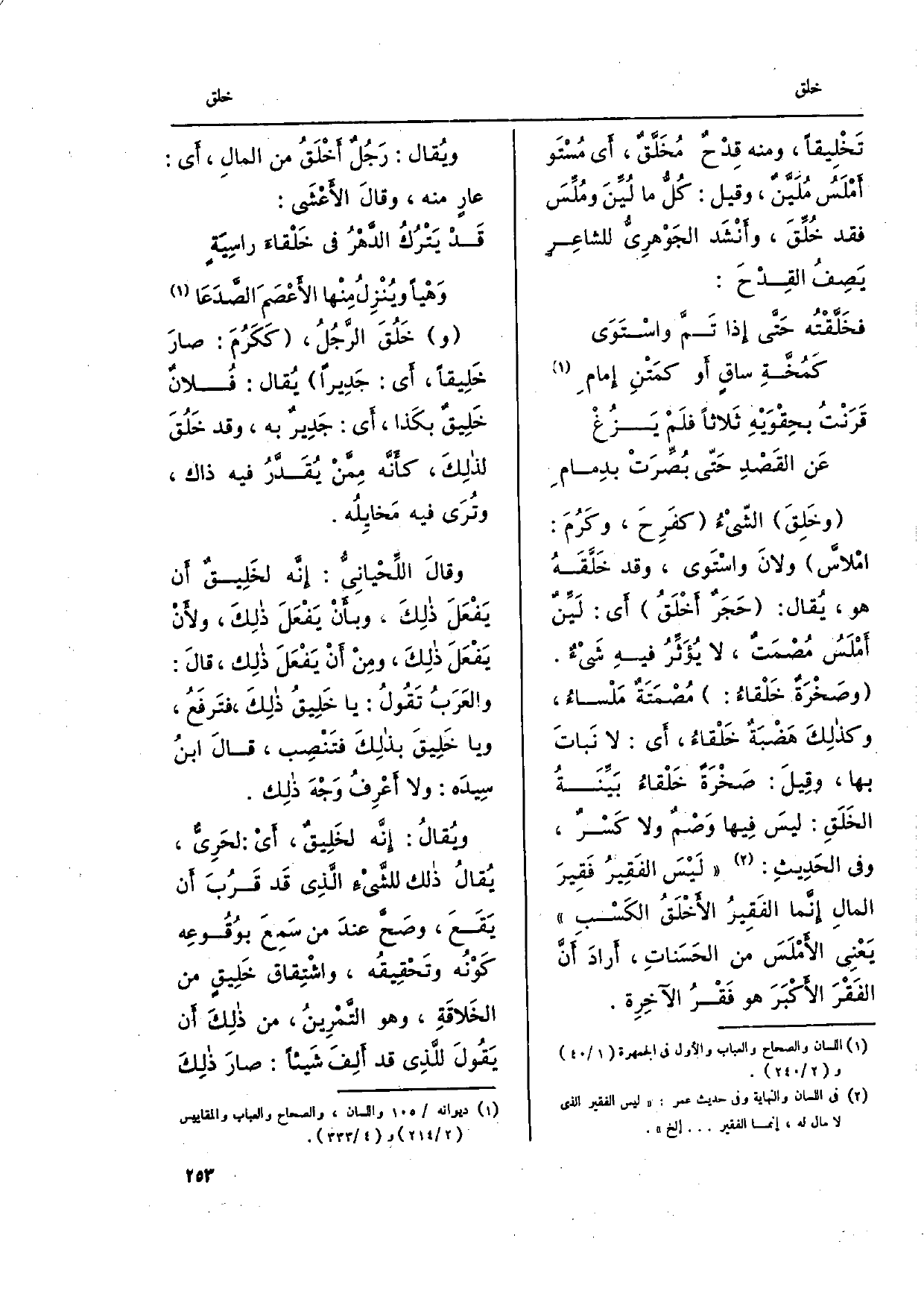 وخَلِقَ الشّيْءُ كفَرِحَ، وكَرُمَ: امْلأسُّ ولانَ واسْتَوى، وَقد خَلَّقَهُ هُوَ، يُقال: حَجَرٌ أَخْلَقُ أَي: لَين أمْلَسُ مُصْمَتٌ، لَا يُؤَثِّرُ فِيهِ شَيءٌ. وصَخْرَةٌ خَلْقاءُ: مُصْمَتَةٌ مَلْساءُ، وكذلِكَ هَضْبَةٌ خَلْقاءُ، أَي: لَا نَباتَ بهَا، وقِيلَ: صَخْرَةٌ خَلْقاءُ بَيِّنَةُ الخَلَقِ: ليسَ فِيها وَصْمٌ وَلَا كَسْرٌ، وَفِي الحَدِيث: لَيْسَ الفَقِيرُ فَقِيرَ المالِ إنَّما الفَقِيرُ الأَخْلَقُ الكَسْب يَعْنِي الأَمْلَسَ من الحَسَناتِ، أرادَ أنَّ الفَقْرَ الأكْبَرَ هُوَ فَقْرُ الآخِرِة.