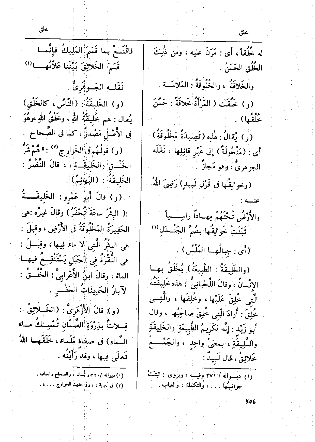 والخَلِيقَةُ: الطَّبِيعَةُ يُخْلَقُ بهَا الإنْسانُ، وقالَ اللِّحْيانِي: هَذِه خَلِيقَتُه الَّتِي خُلِقَ عَلَيْها، وخُلِقَها، والَّتِي خُلِقَ: أَرادَ الّتِي خُلِقَ صاحِبُها، وَقَالَ أَبو زَيْد: إِنَّه لكَرِيمُ الطَّبِيعَةِ والخَلِيقَةِ والسَّلِيقَةِ، بِمَعْنى واحِدٍ، والجَمْعُ خلاَئِقُ، قَالَ لَبِيدٌ: