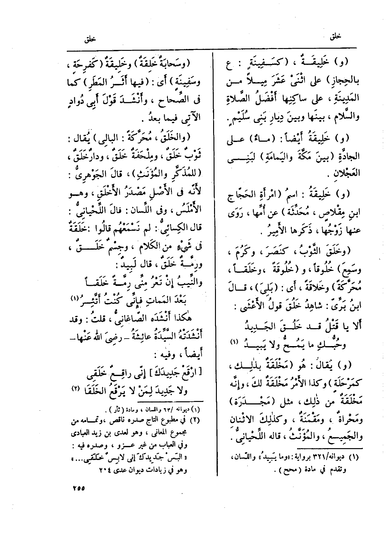 وخَلِيقَةٌ، كسَفِينَة: ع بالحِجازِ على اثْنَيْ عَشَرَ مِيلاً من المَدِينَةِ، على ساكِنِها أفْضَلُ الصَّلاةِ والسُّلام، بينَها وبينَ دِيارِ بَنِى سُلَيْم. وخَلِيقَةُ أيْضاً: ماءٌ إِلَى الجادة بينَ مَكةَ واليَمامَةِ لبَنِي العَجْلانِ.