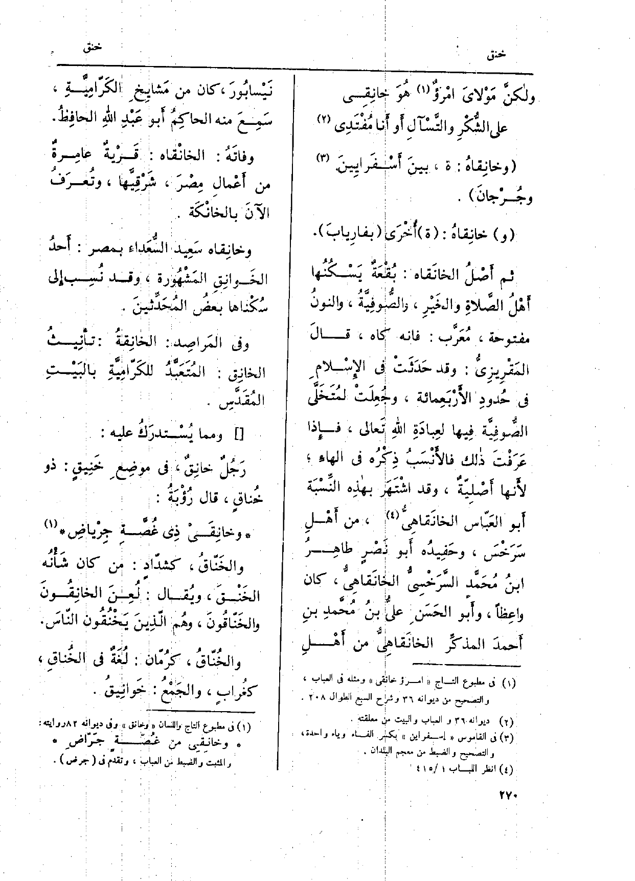 ثمَّ أَصْلُ الخانَقاه: بُقْعَةٌ يَسْكُنُها أَهْلُ الصَّلاةِ والخَيْرِ، والصُّوفِيَّةُ، والنونُ مَفْتُوحَة، مُعَرَّب: فانه كاه، قالَ المَقْرِيزِيُّ: وَقد حَدَثَتْ فِي الْإِسْلَام فِي حُدودِ الأرْبَعِمائة، وجُعِلَتْ لمُتَخَلَّىَ الصوفيَّة فِيها لعِبادَةِ اللهِ تَعالى، فَإِذا عَرَفْتَ ذَلِك فالأنْسَبُ ذِكْرُه فِي الهاءَ، لِأَنَّهَا أصْلِيّةٌ، وَقد اشْتَهَر بهذِه النِّسْبَة أَبو العَبّاس الخانقاهِي، من أهْلِ سَرَخْسَ، وحَفِيدُه أَبو نَصْرٍ طاهِرُ ابنُ مُحَمد السرَخْسيُّ الخانَقاهِي، كَانَ واعِظاً، وأَبو الحَسَنِ عليُّ بنُ مُحَّمدِ بنِ أَحمدَ المذكِّر الخانَقاهِي من أَهْلِ نَيْسابُورَ، كَانَ من مَشايِخ الكَرّامِيةِ، سَمِعَ مِنْهُ الْحَاكِم أَبو عَبْدِ اللهِ الحافِظُ.