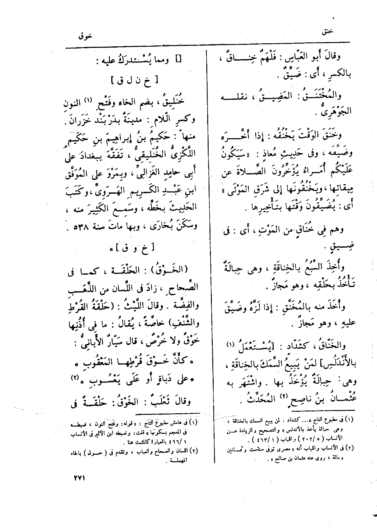 وخَنَقَ الوَقتَ يَخْنُقُه: إَذا أَخَّرَه وضَيَّقَه، وَفِي حَدِيثِ مُعاذٍ: سيَكُونُ عَلَيْكُم أمراءُ يُؤخَّرُونَ الصلاةَ عَن مِيقاتِها، وِيَخْنُقونَها إِلى شَرَقِ المَوْتَى أَي: يُضَيقُونَ وَقْتَها بتَأخِيرِها.)