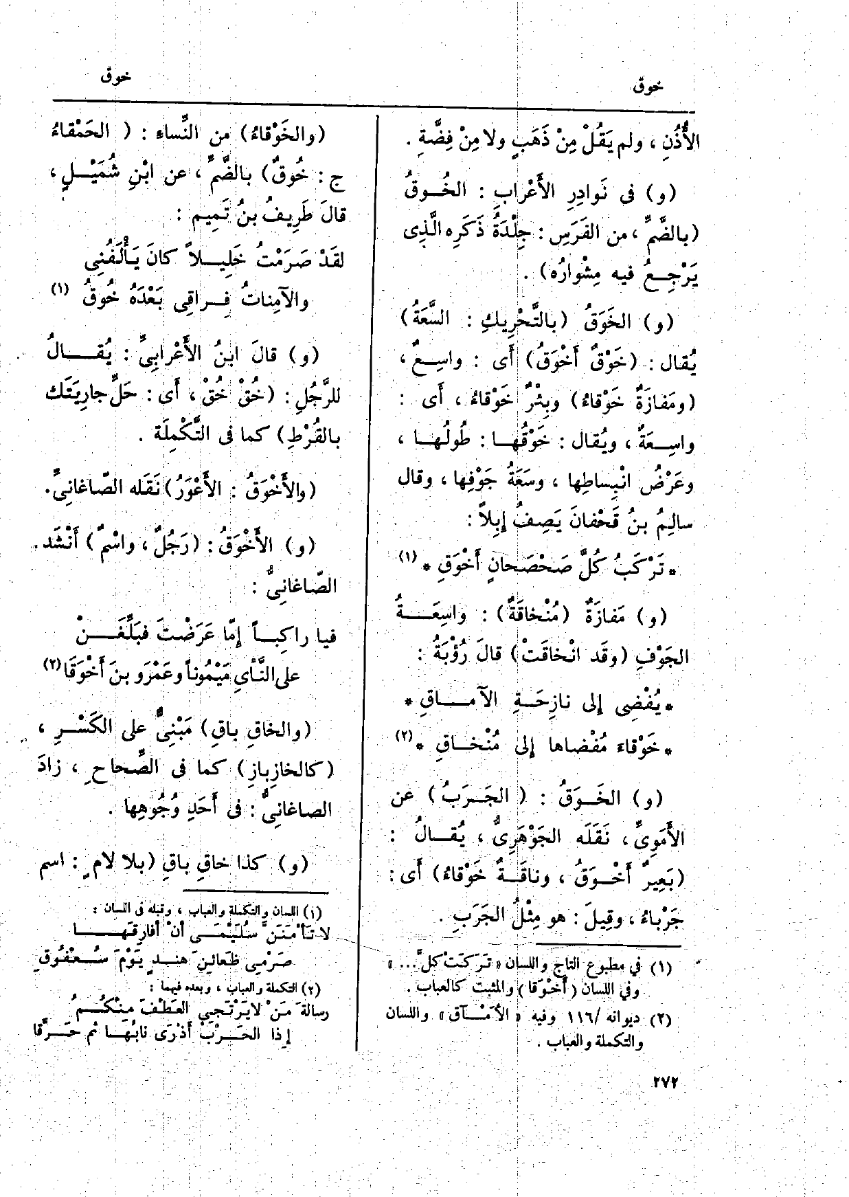 } والخَوْقاءُ من النِّساءَ: الحَمقاءُ ج: {خُوقٌ بالضَّمِّ، عَن ابْنِ شُمَيْلٍ، قالَ طَرِيفُ بنُ تَمِيم:
