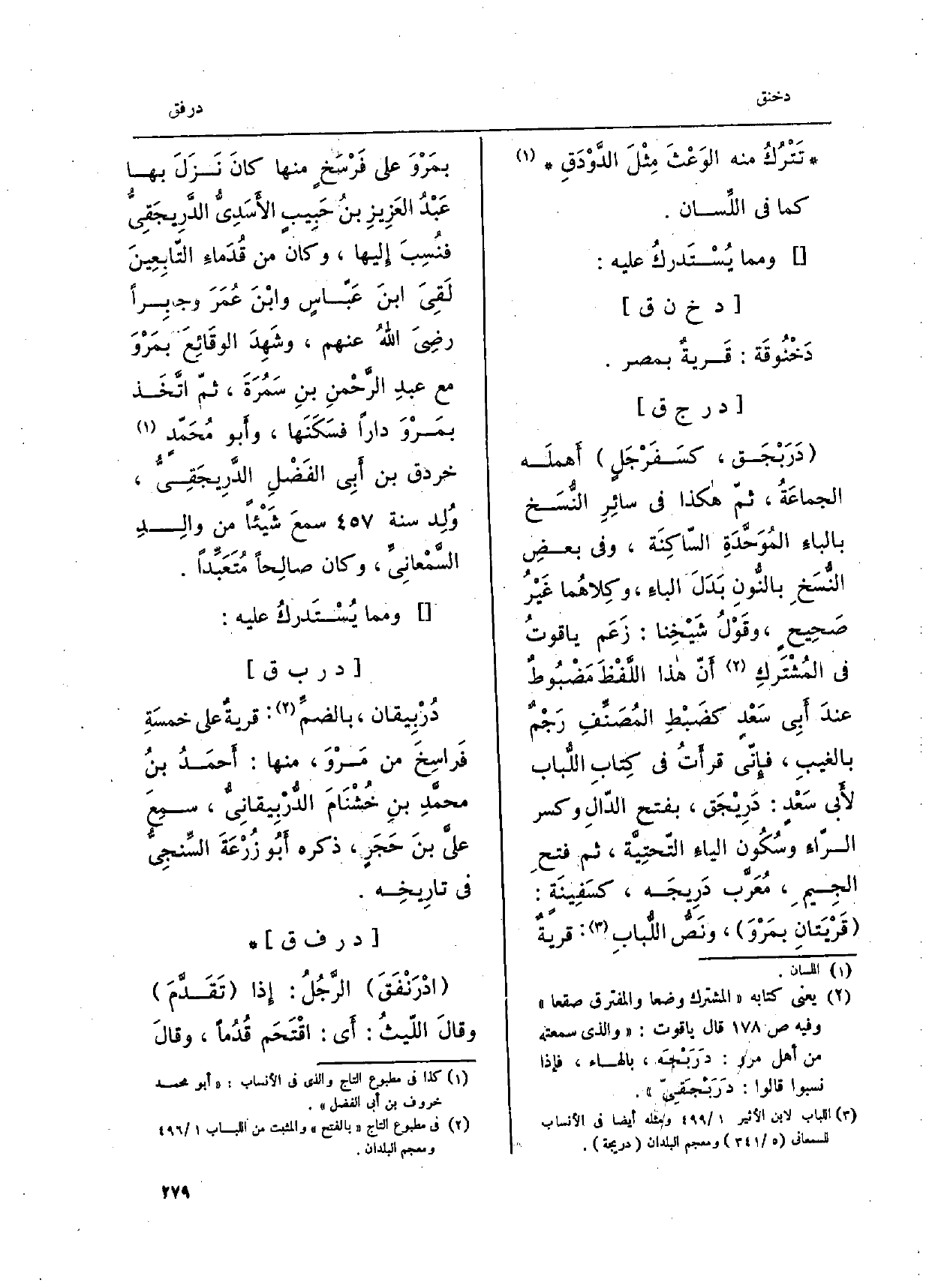 دَرَبْجَق، كسَفَرْجَلٍ أَهملَه الجماعَةُ، ثمّ هَكَذَا فى سائِرِ النسَخ بالباءَ المُوَحَّدَةِ السّاكِنَة، وَفِي بعضِ النسَخِ بالنونِ بَدَلَ الباءِ، وكِلاهُما غَيْر صَحِيح، وقَوْلُ شَيْخِنا: زَعَم ياقوت فِي المُشْتَركِ أَنّ هَذَا اللَّفْظَ مَضْبُوطٌ عندَ أَبِي سَعْدٍ كضَبْطِ المُصَنِّفِ رَجْمٌ بالغيبِ، فإِنّي قرأَتُ فِي كِتابِ اللِّباب لأبي سَعْد: دَرِيْجَق، بِفَتْح الدّالِ وَكسر الرّاءَ وَسُكُون الياءَ التّحتِية، ثمَّ فتح الجِيم، مُعَرب دَرِيجَه، كسَفِينَةٍ: قَرْيَتانِ بمَرْوَ، ونَصُّ اللُّبابِ: قريةٌ بمَرْوَ على فَرْسَخٍ مِنْهَا كَانَ نَزَل بهَا عَبْدُ العَزِيزِ بنُ حَبِيبٍ الأسَدِي الدَّرِيجَقِيُّ فنُسِبَ إِليها، وَكَانَ من قُدَماءِ التّابعِينَ لَقِىَ ابنَ عَبّاسٍ وابْنَ عُمَرَ وجابِراً رضِيَ اللهُ عَنهُ، وشَهدَ الوقائعَ بمَروَ مَعَ عبدِ الرَّحْمنِ بنِ سَمُرَةَ، ثمَّ اتَّخَذ بمَرْوَ دَارا فسَكَنَها، وأَبو مُحَمّدٍ خردق بن أَبِي الفَضْلِ الدَّرِيجَقي وُلِد سنة سمعَ شَيْئا من والدِ السَّمْعانِيِّ، وَكَانَ صالِحاً مُتَعَبِّدًا.