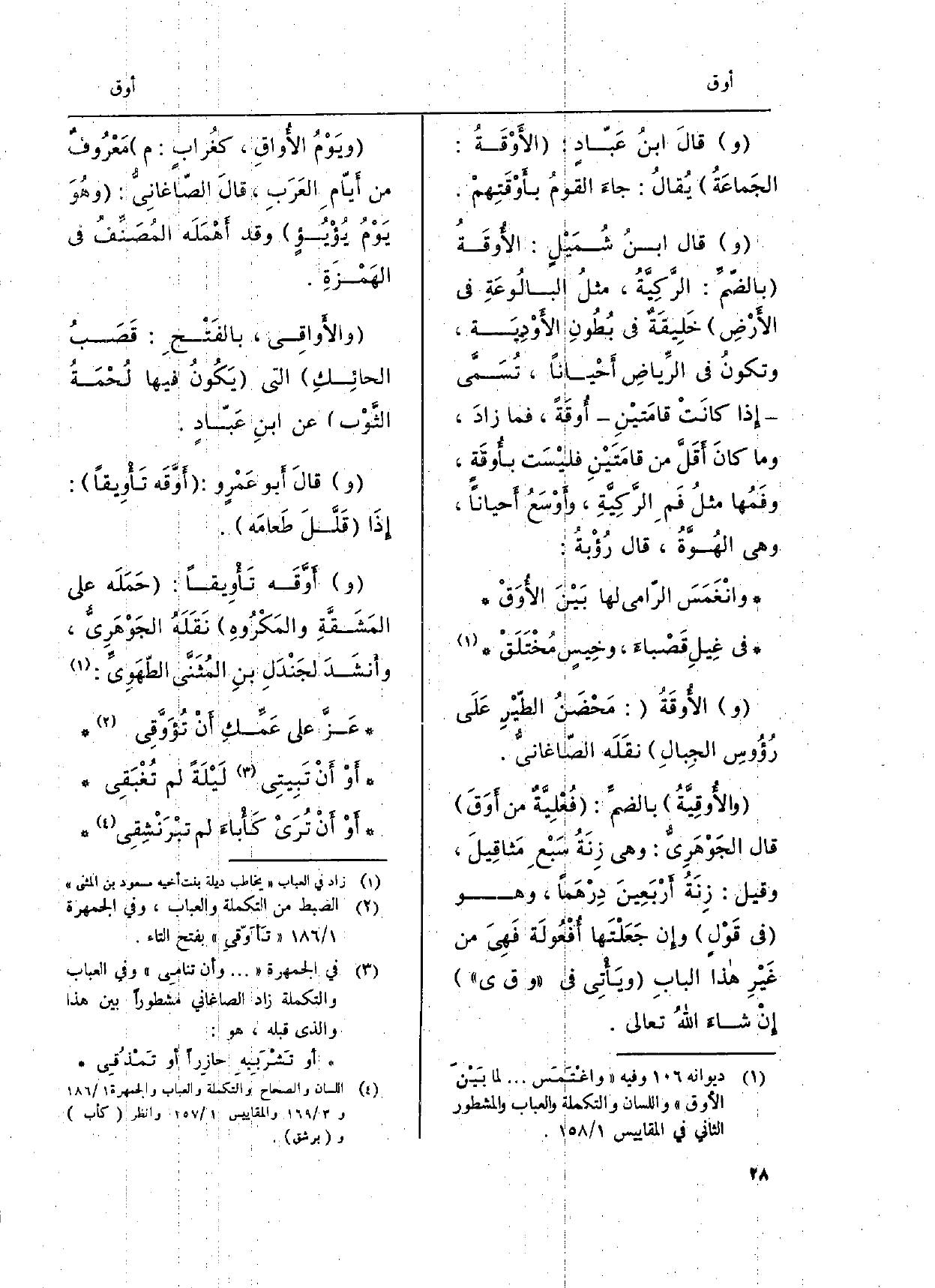 (و) {الأوقَةُ: مَحْضَنُ الطّيرِ عَلَى رُؤُوسِ الجِبالِ نقَلَه الصّاغاني.} والأوقِيَّة بِالضَّمِّ: فُعلِيَّةٌ من أَوَقَ قَالَ الجَوْهَري وَهِي زِنَةُ سَبعْ مَثاقِيلَ، وَقيل: زِنَة أربَعِينَ درْهَماً، وَهُوَ فِي قَوْل وَإِن جَعَلْتهَا أفعُولَة فهِي من غَيْر هَذَا البابِ ويَأتِي فِي وق ي إنْ شَاءَ اللهُ تَعَالَى. وَيَوْم {الأواقِ كغراب: م مَعْرُوف من أَياّم العَرَبِ، قالَ الصاغانِي: وهوَ يؤيؤٍ وَقد أَهملَه المصنفُ فِي الهَمْزةِ.} - والأَواقي، بالفتْحِ: قَصَبُ الحائك الَّتِي يكون فِيهَا لحْمَة الثَّوْب عَن ابْن عباد. وقالَ أَبو عمْرو: {أَوَقه} تأويقاً: إِذَا قَلَّل طَعَامه وأَوَّقَه تَأوِيقاً: حَمَلَه على الَمثسَقَّةِ والمكروهِ نَقَلَه الجَوهري، وَأنْشد لجَندَلِ بنِ المثنَى الطهوِي:) عَزَّ على عَمكِ أّنْ! - تؤَوَّقِي أَوْ أَنْ تَبِيتي لَيلَةً لم تُغبَقِي أَوْ أنْ ترَىْ كأباءَ لم تبْرَنْشِقِي