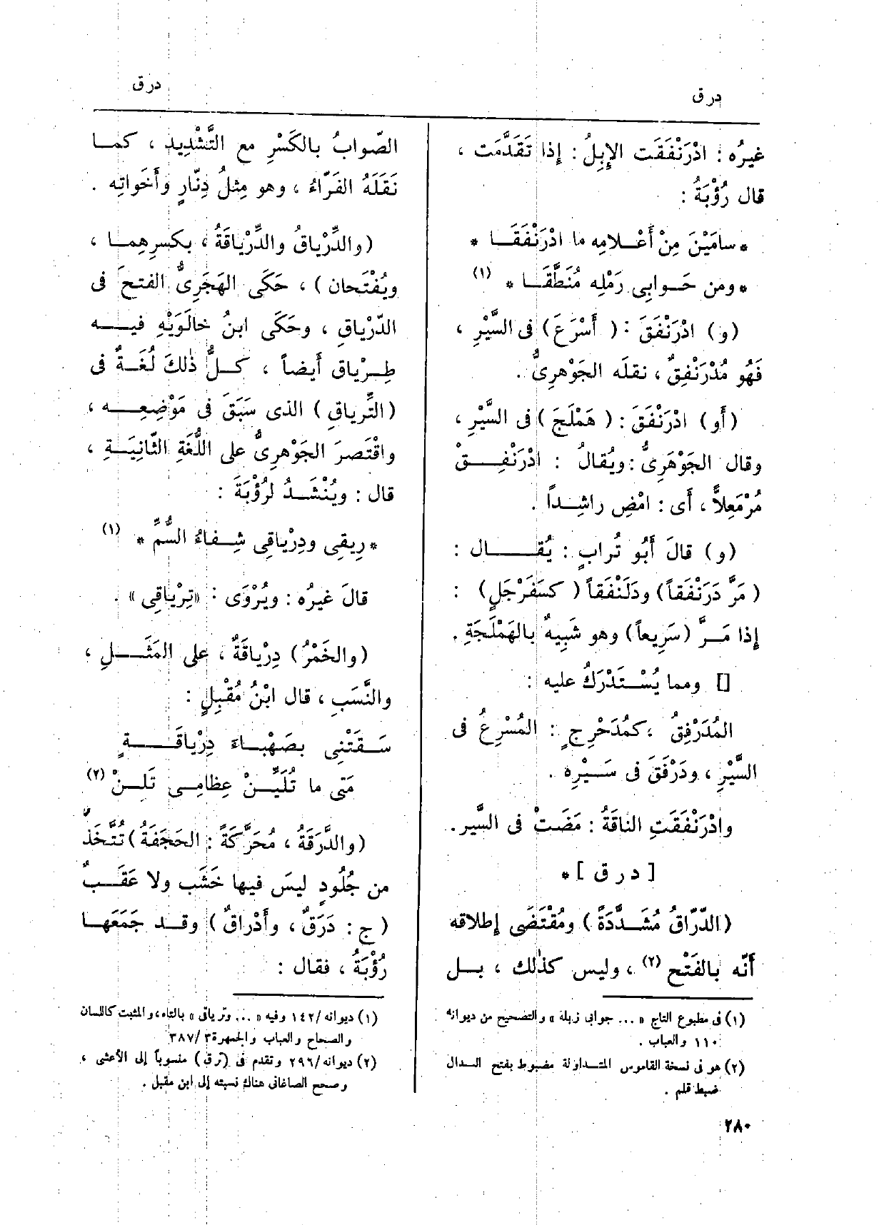 غيرُه: ادْرَنْفَقَت الإِبِلُ: إِذا تَقَدَّمَت، قَالَ رُؤْبَةُ: سامَيْنَ مِنْ أَعْلامِه مَا ادْرَنْفَقَا وَمن حَوابِي رَمْلِه مُنَطَّقَا وادْرَنْفَقَ: أسْرَعَ فى السَّيرِ، فَهُو مُدْرَنْفِقٌ، نقلَه الجَوْهرِيُّ. أَو ادْرَنْفَق: هَمْلَجَ فِي السَّيْرِ، وَقَالَ الجَوْهَرِيّ: ويُقالُ: ادْرَنْفَقْ مُرْمَعِلاًّ، أَي: امْضِ راشِدًا.