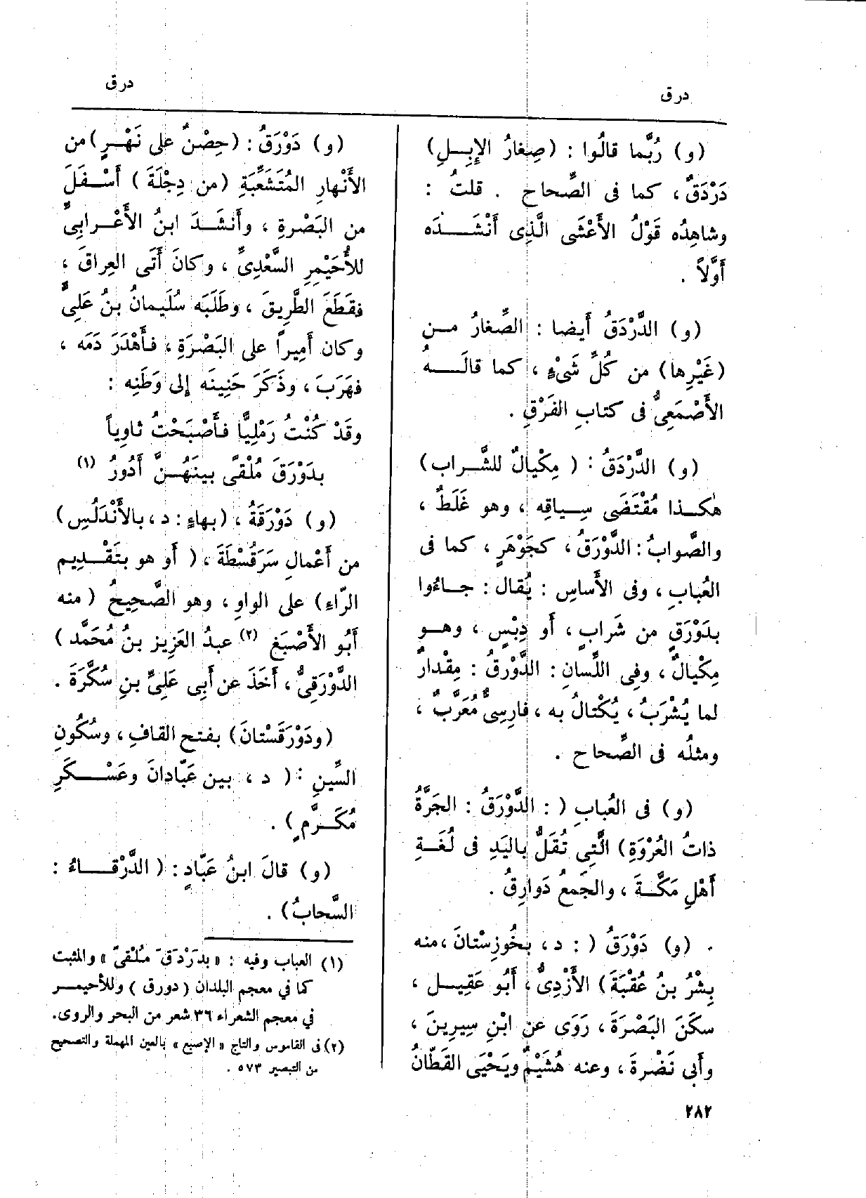 ودَوْرَقُ: د بخُوزِسْتانَ، مِنْهُ بِشْرُ بنُ عقبَةَ الأزْدي، أَبُو عَقِيل، سكَنَ البَصْرَةَ، رَوَى عَن ابْنِ سِيرِينَ، وأَبي نَضْرةَ، وَعنهُ هُشَيْم ويَحْيَى القَطّانُ ودَوْرَقُ: حِصْنٌ على نَهْرٍ من الأَنْهارِ المُتَشَعِّبَةِ من دجلَةَ أَسْفَلَ من البَصْرةِ وأَنشَدَ اَبنُ الأَعْرابِيِّ للأُحَيْمِرِ السَّعْدِيِّ، وكانَ أَتَى العِراقَ،)