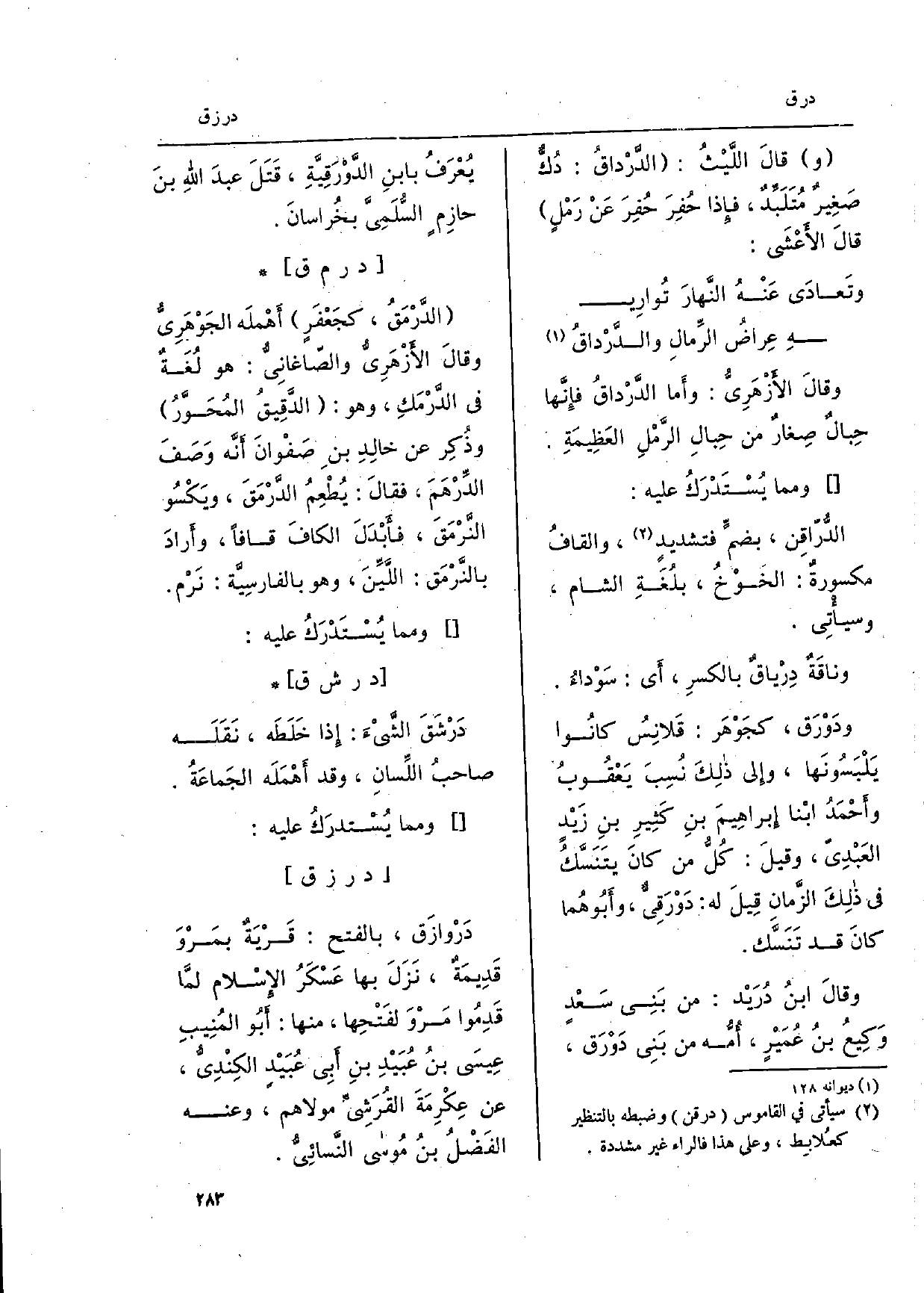 (وتَعادَى عَنْهُ النَّهارَ تُوارِي ... هـ عِراضُ الرِّمالِ والدَّرْداقُ)