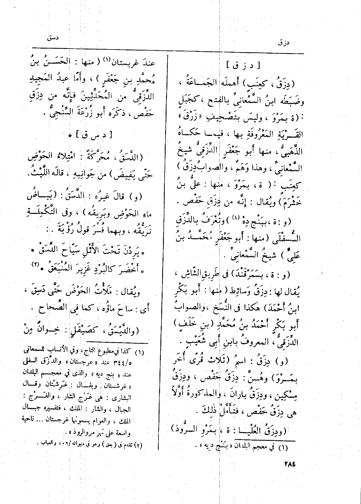دِزَق، كعِنَبٍ أهملَه الجَماعَةُ، وضَبَطَه ابنُ السَّمْعانِيِّ بِالْفَتْح، كجَبَلٍ: ة بمَروَ، وليسَ بتَصْحِيفِ زَرْقَ القَرْيَةِ المَعْرُوفَةِ بهَا، فِيمَا حَكاهُ الذَّهَبيُّ، مِنْهَا أَبو جَعْفَرٍ الدِّزَقِيُّ شيخُ السَّمْعانِيِّ، وَهَذَا وَهَمٌ، والصوابُ دِزَق كعِنَبٍ: ة، بمَرْوَ، مِنْهَا: عَليّ بنُ خَشْوَمَ ويُقال: إنَّه من دِزَقِ، حَفص. و: ة، ببَخْج دِهْ وتُعْرَف بالدِّزَقِ السُّفْلَى مِنْهَا: أَبو جَعْفَرٍ، مُحَمَّدُ بنُ عَلِيٍّ شيخُ السَّمْعانِيِّ. و: ة، بسَمَرْقَنْدَ فِي طَرِيقِ الشّاشِ، يُقال لَهَا: دِزَقُ وَسائِط مِنْهَا: أَبو بَكْرِ ابنُ أَحْمَدَ هَكَذَا فِي النُّسَخ، والصوابُ أَبو بَكْرٍ أَحْمَدُ بنُ مُحَمَّدِ بنِ خَلَفٍ الدِّزَقِي، المعروفُ بابنِ أَبِي شعَيْبٍ.