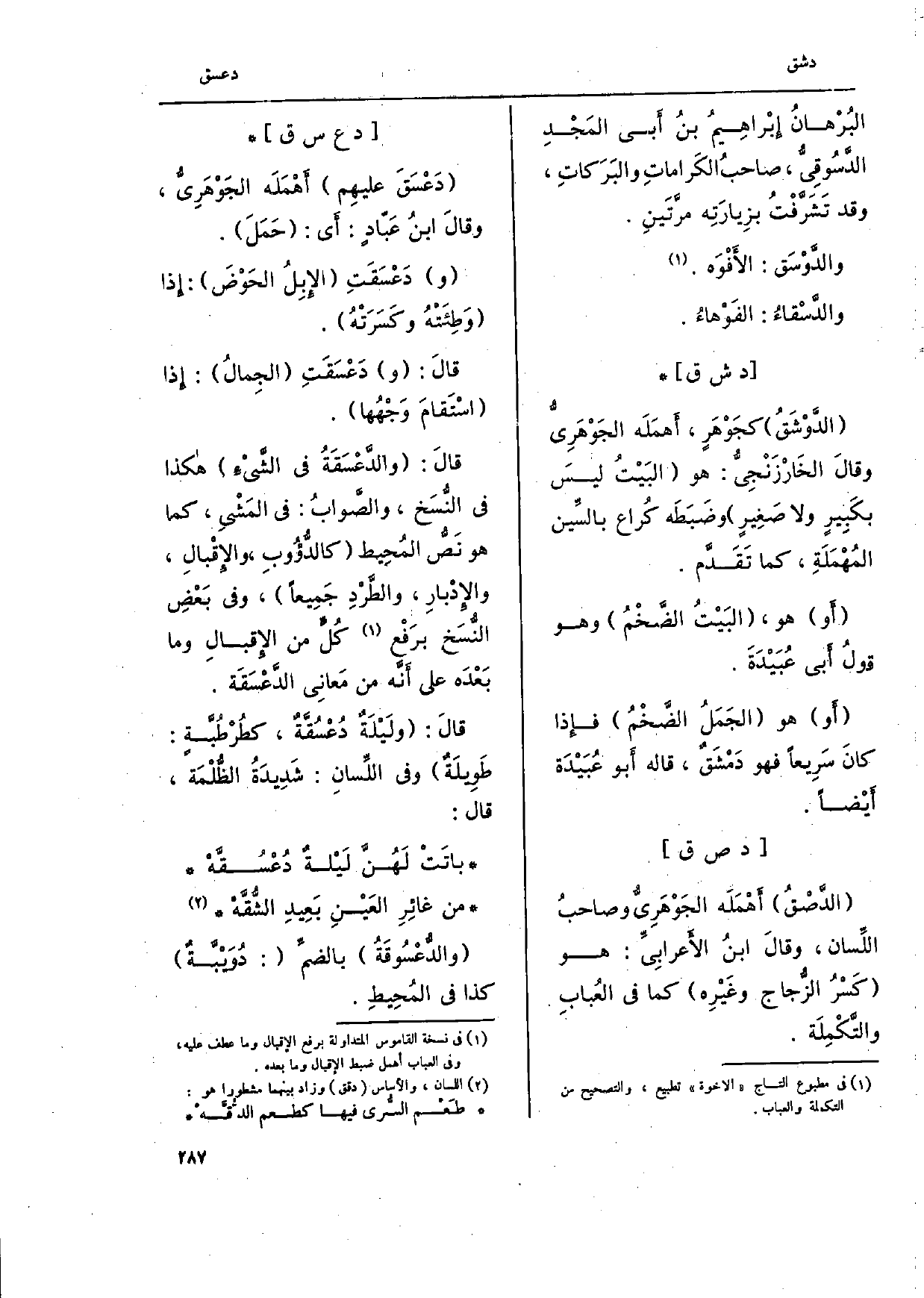 قالَ: ولَيْلَةٌ دُعْسُقَّةٌ، كطُرْطُبَّةٍ: طَوِيلَةٌ وَفِي اللِّسانِ: شَدِيدَةُ الظلْمَة، قَالَ: باتَتْ لَهُنَّ لَيْلةٌ دُعْسُقَّهْ من غائِرِ العَيْنِ بَعِيدِ الشُّقَّهْ والدٌّ عسوقَةُ بالضمِّ: دُوَيْبَّة كَذَا فِي المُحِيطِ.