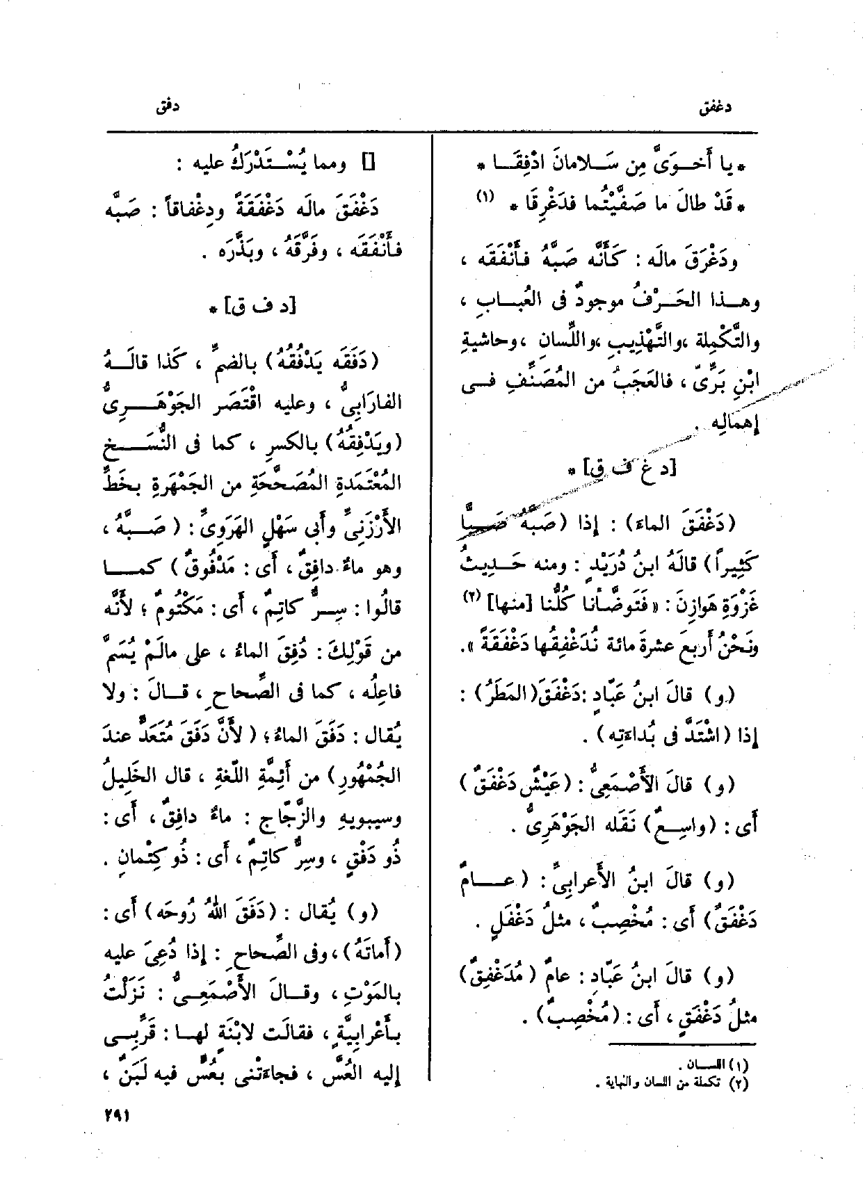 يَا أَخوَيَّ مِن سَلامانَ ادْفِقَا قَدْ طالَ مَا صَفَّيْتُما فدَغْرِقَا ودَغْرَقَ مالَه: كَأَنَّه صَبَّهُ فأنْفَقَه، وَهَذَا الحَرْفُ موجودٌ فِي العُبابِ، والتُّكْمِلة، والتَّهْذِيب، واللِّسانِ، وحاشيةِ ابْنِ بَرِّيّ، فالعَجَبُ من المُصَنَّفِ فِي إهمِاله.