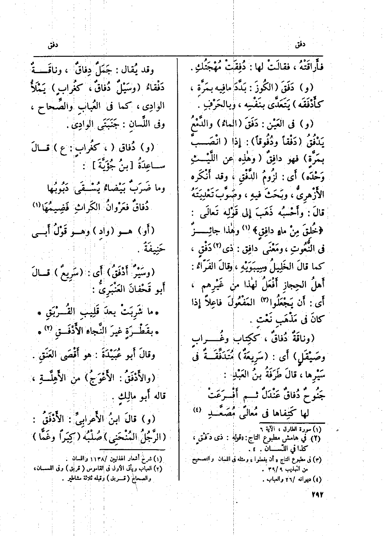 وناقَةٌ دُفاقٌ، ككِتاب وغرابٍ وصَيْقَل أَي: سَرِيعَةٌ مُتَدَفِّقَةٌ فِي سَيْرِها، قالَ طَرَفَةُ بنُ العَبْدِ: