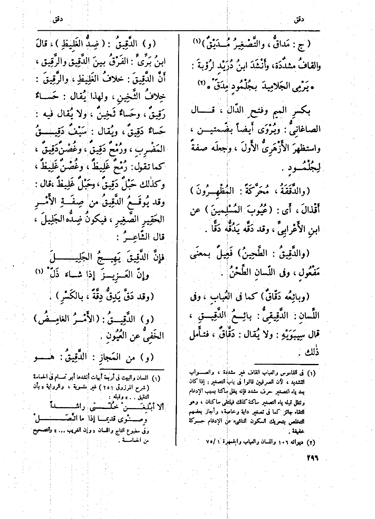 (و) } الدَّقِيقُ: ضِدُّ الغَلِيط، قالَ ابْن بَرَيٍّ: الفَرْقُ بينَ {الدَّقِيق والرَّقيق، أَن الدقيقَ: خلافُ الغَلِيظِ، والرقِيقَ خلافُ الثَّخِينِ، وَلِهَذَا يُقال: حَساءٌ دَقِينّ، وحَساءٌ ثَخِين، وَلَا يُقال فِيهِ: حَساءٌ} دَقِيقٌ، ويُقال: سَيفٌ دَقِيقُّ المَضْرِبِ، ورُمْحٌ دَقيقُ، وغصْنٌ دقِيقٌ، كَمَا تقّول: رُمْحٌ غَلِيظٌ، وغُصْنٌ غلِيظٌ، وَكَذَلِكَ حبْلٌ دَقِيق، وحَبلٌ غَلِيظٌ، قَالَ: وَقد يُوقَعُ الدَّقِيقُ من صِفةِ الأمرِ الحَقِيرِ الصَّغِيرِ، فَيكون ضِده الجَلِيل، قَالَ الشاعِرُ:
