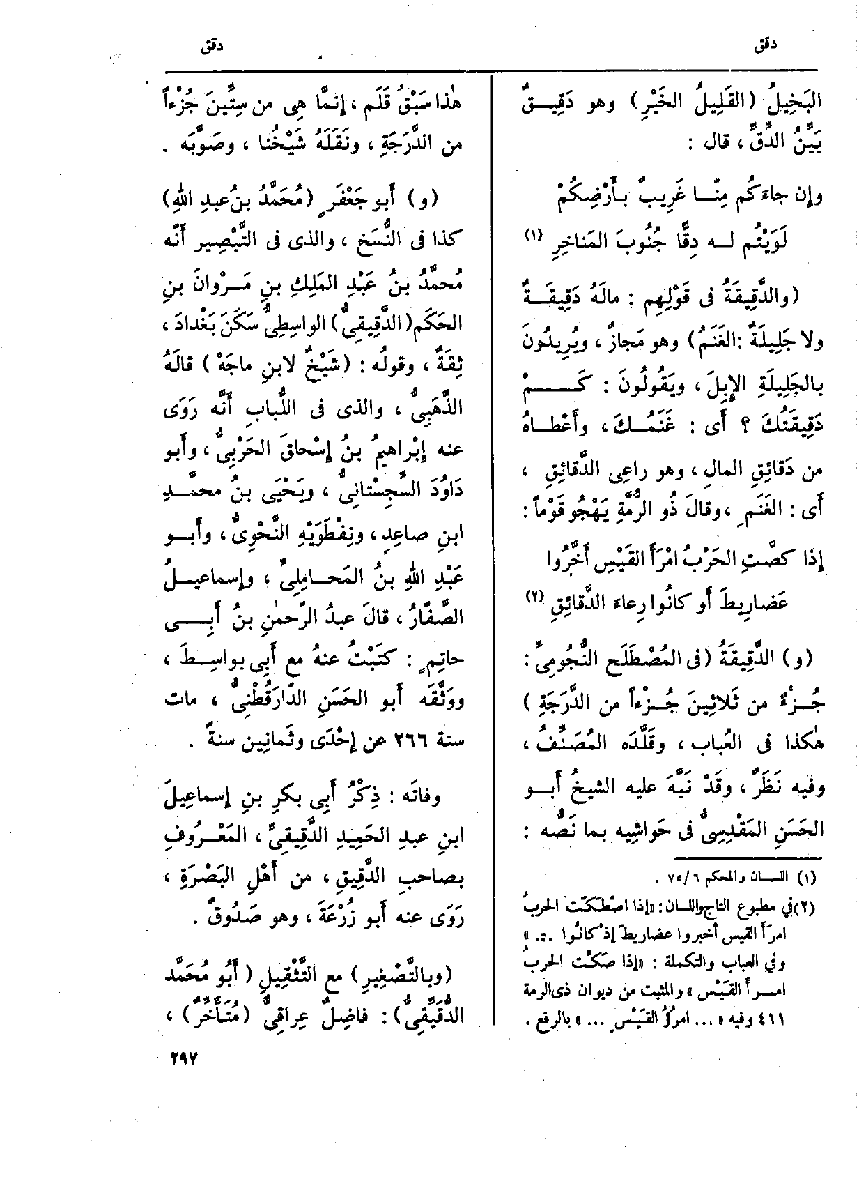 وفاتَه. ذِكْرُ أبِي بكرِ بنِ إِسماعِيلَ ابنِ عبدِ الحَمِيدِ الدَّقِيقِيِّ، المَعْرُوفِ بصاحبِ الدَّقِيقِ، من أَهْل البَصْرَةِ، رَوَى عَنهُ أَبو زُرعَةَ، وَهُوَ صَدُوق. وبالتَّصْغِيرِ مَعَ التَّثْقِيل أَبُو مُحَمَّد الدُّقَيِّقِي: فاضِلٌ عِراقِيٌ مُتَاخِّرٌ،