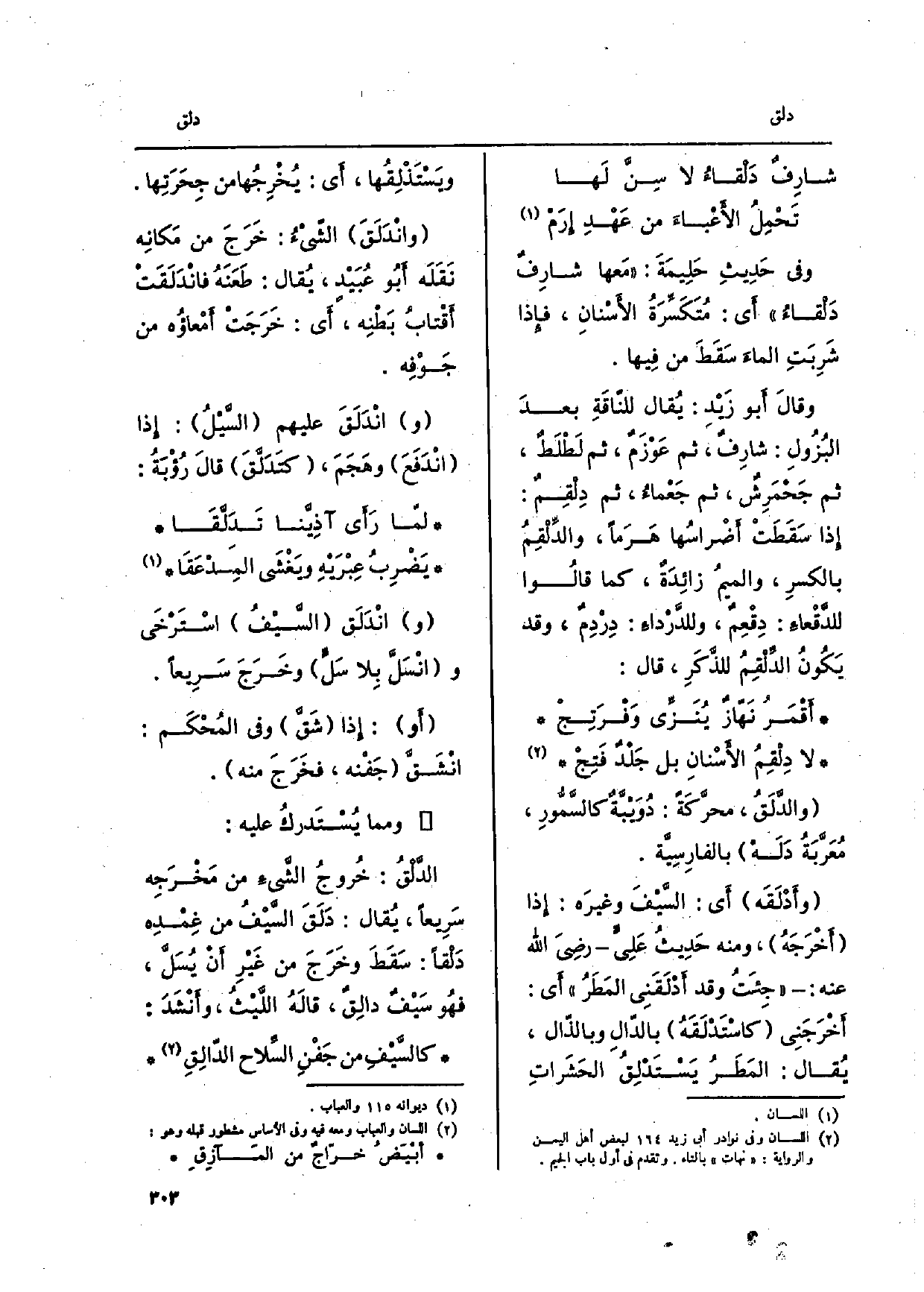 وقالَ أَبو زَيْدِ: يُقَال للنّاقَةِ بعدَ البُزُولِ: شارِفٌ، ثمَّ عَوْزَمٌ، ثمَّ لَطْلَطٌ، ثمَّ جَحْمَرِشٌ، ثمَّ جَعْماءُ، ثمَّ دِلْقِمٌ: إِذا سَقَطَتْ أَضْراسُها هَرَماً، والدِّلْقِمُ بالكسرِ، والميمُ زائِدَة، كَمَا قالُوا للدَّقْعاءَ: دِقْعِم، وللدَّرْداء: دِردِمٌ، وَقد يكُونُ الدِّلْقِمُ للذكَرِ، قَالَ: أقْمَرُ نَهّازٌ يُنَزِّى وَفْرَتِجْ لَا دِلْقِمُ الأسْنانِ بل جَلْدُ فَتِجْ والدَّلَقُ، محرَّكَةً: دُوَيبةٌ كالسَّمُّورِ، مُعَربَةُ دَلَهْ بالفارِسِية. وأدْلَقَه أَي: السَّيْفَ وغيرَه: إِذا أخْرَجَهُ، وَمِنْه حَدِيثُ عَلِي رضِيَ الله عَنهُ: جِئتُ وَقد أَدْلَقَنِي المَطَرُ أَي: أَخْرَجَنِي كاستَدْلَقَهُ بالدّالِ وبالذّال، يُقال: المَطَرُ يسَتدْلِقُ الحَشَراتِ ويَسْتَذْلِقُها، أَي: يُرِجُها من جِحَرَتِها. وانْدَلَقَ الشّيْءُ: خَرَج من مَكانِه نَقَلَه أبُو عُبَيْد، يُقال: طَعَنَهُ فانْدَلَقَتْ أَقْتابُ بَطْنِه، أَي: خَرَجَتْ أمْعاؤُه من جَوْفِه.