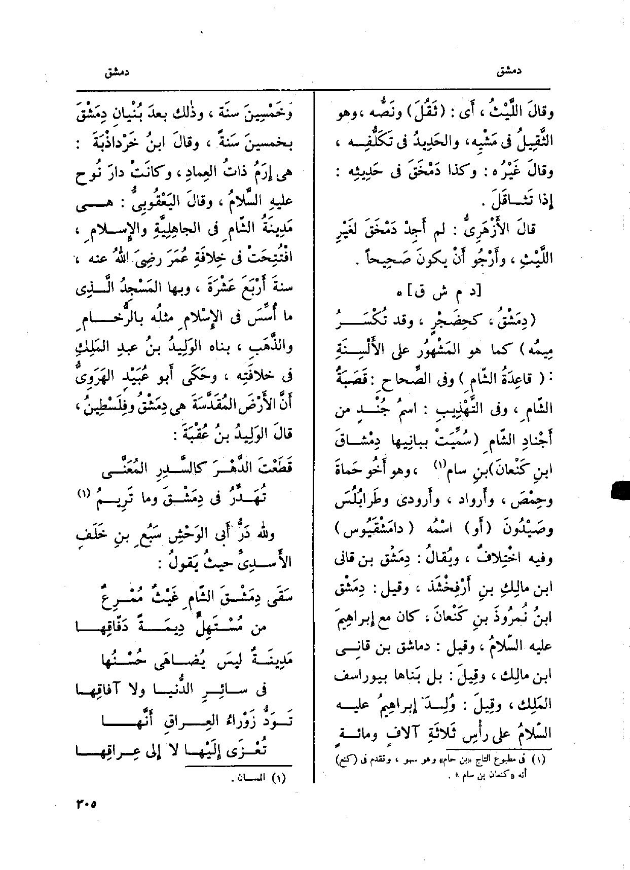 دِمَشْقُ، كحِضَجْرٍ، وَقد تُكْسَر مِيمُه كَمَا هُوَ المَشْهوُر على الألْسِنَةِ: قاعِدَةُ الشّام وَفِي الصِّحاح: قَصَبَة الشّام، وَفِي التَّهْذِيبِ: اسمُ جُنْدٍ من أَجْنادِ الشّام سُمّيَتْ ببانِيها دِمْشاقَ ابنِ كَنْعانَ بنِ سَام، وَهُوَ أَخُو حَماةَ وحِمْصَ، وأرواد وأَرودى وطَرابُلُسَ وصَيْدونَ أَو اسْمُه دامَشْقَيُوس وَفِيه اخْتِلافٌ، ويُقالُ: دِمَشْق بن قاني ابْن مالِكِ بنِ أرْفِخْشَذ، وَقيل: دِمَشق ابنُ نُمرُوذَ بنِ كَنْعانَ، كَانَ مَعَ إِبراهِيمَ عَلَيْهِ السّلامُ، وَقيل: دماشق بن قانِي ابْن مالِك، وقِيلَ: بل بَناها بيوراسف المَلِك، وقِيلَ: وُلِدَ إِبراهِيمُ عَلَيْهِ السّلامُ على رأسِ ثَلاثَةِ آلافٍ ومائةٍ وَخَمْسِينَ سنَة، وَذَلِكَ بعدَ بُنْيانِ دِمَشقَ بخمسينَ سَنةً، وقالَ ابنُ خَرْداذْبَةَ: هِيَ إِرَمُ ذاتُ العِمادِ، وكانَتْ دارَ نُوح عليهِ السَّلامُ، وقالَ اليَعْقُوبِيًّ: هِيَ مَدِينَةُ الشّام فِي الجاهِلِيَّةِ وَالْإِسْلَام، افْتُتِحَتْ فِي خِلافَةِ عُمَرَرضِيَ اللهُ عَنهُ، سنةَ أَرْبعَ عَشْرَةَ، وَبهَا المَسْجِدُ الذِي مَا أُسِّسَ فِي الإسْلام مثلُه بالرخام والذَّهَبِ، بناه الوَلِيَدُ بنُ عبدِ المَلِكَ فِي خلافَتِه، وحَكَى أَبو عُبَيْد الهَرَوِيًّ أنَّ الأرْضَ المُقَدَّسَةَ هِيَ دِمَشْق وفِلَسْطِين، قالَ الوَلِيدُ بنُ عُقْبَةَ: