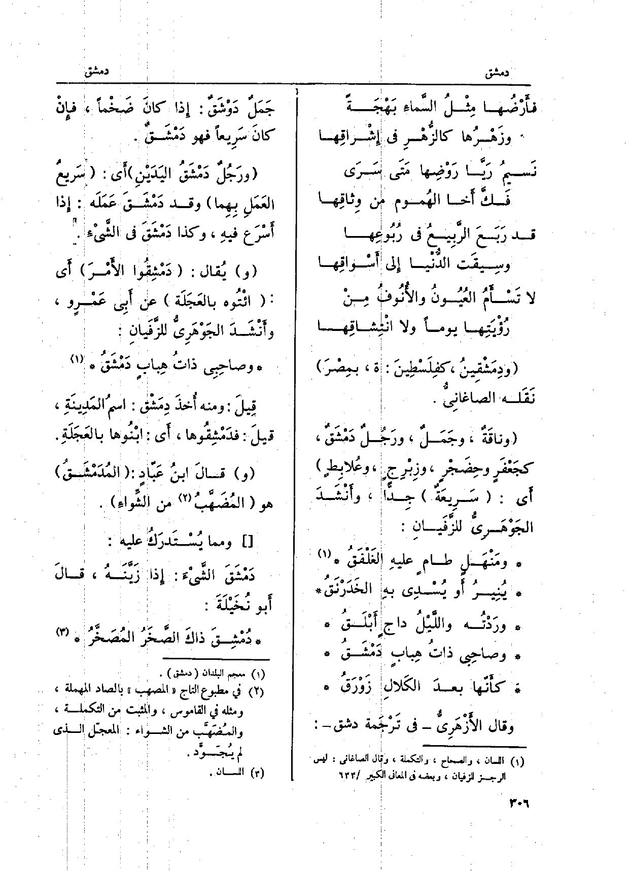 ودِمَشْقِين كفِلَسْطِينَ: ة، بمِصْرَ نَقَله الصاغانِيُّ. وناقَةٌ، وجَمَلٌ، ورَجُلٌ دَمْشَقٌ، كجَعْفَرٍ وحِضَجْرٍ، وزِبْرِجٍ، وعُلابِطٍ أَي: سَرِيعَة جِداً، وأَنْشَدَ الجَوْهَرِيُّ للزفَيانِ: ومَنْهَلٍ طام عليهِ الغَلْفَقُ ينُيرُ أَو يُسْدِى بهِ الخَدَرْنَقُ ورَدْتُه واللَّيْلُ داجٍ أبْلَقُ وصاحِبي ذاتُ هِبابٍ دَمْشَق كأنّها بعدَ الكَلالِ زَوْرَقُ وَقَالَ الأزْهَرِيُّ فِي ترجَمة دشق: جَمَلٌ دوْشَقٌ: إِذا كانَ ضَخْماً، فإنْ كانَ سَرِيعاً فَهُوَ دَمْشَق. ورَجُلٌ دَمْشَقُ اليَدَيْنِ أَي: سَريعُ العَمَلِ بِهِا وَقد دَمْشَقَ عَمَلَه: إِذا أسْرَع فيهِ، وَكَذَا دَمْشَقَ فِي الشيْء. ويُقال: دَمْشِقُوا الأمْرَ أَي: ائْتُوه بالعَجَلَة عَن أبِي عَمْروٍ، وأنشَدَ الجَوْهَرِيُّ للزَّفَيانِ: وصاحِبِي ذاتُ هِبابٍ دَمْشَقُ قِيلَ: وَمِنْه أُخذَ دِمَشْق: اسمُ المَدِينَةِ، قيلَ: فدَمْشِقُوها، أَي: ابْنُوها بالعَجَلَةِ. وقالَ ابنُ عَبّادٍ: المُدَمْشَقُ هُوَ المُضَهَّبُ من الشِّواءَ.