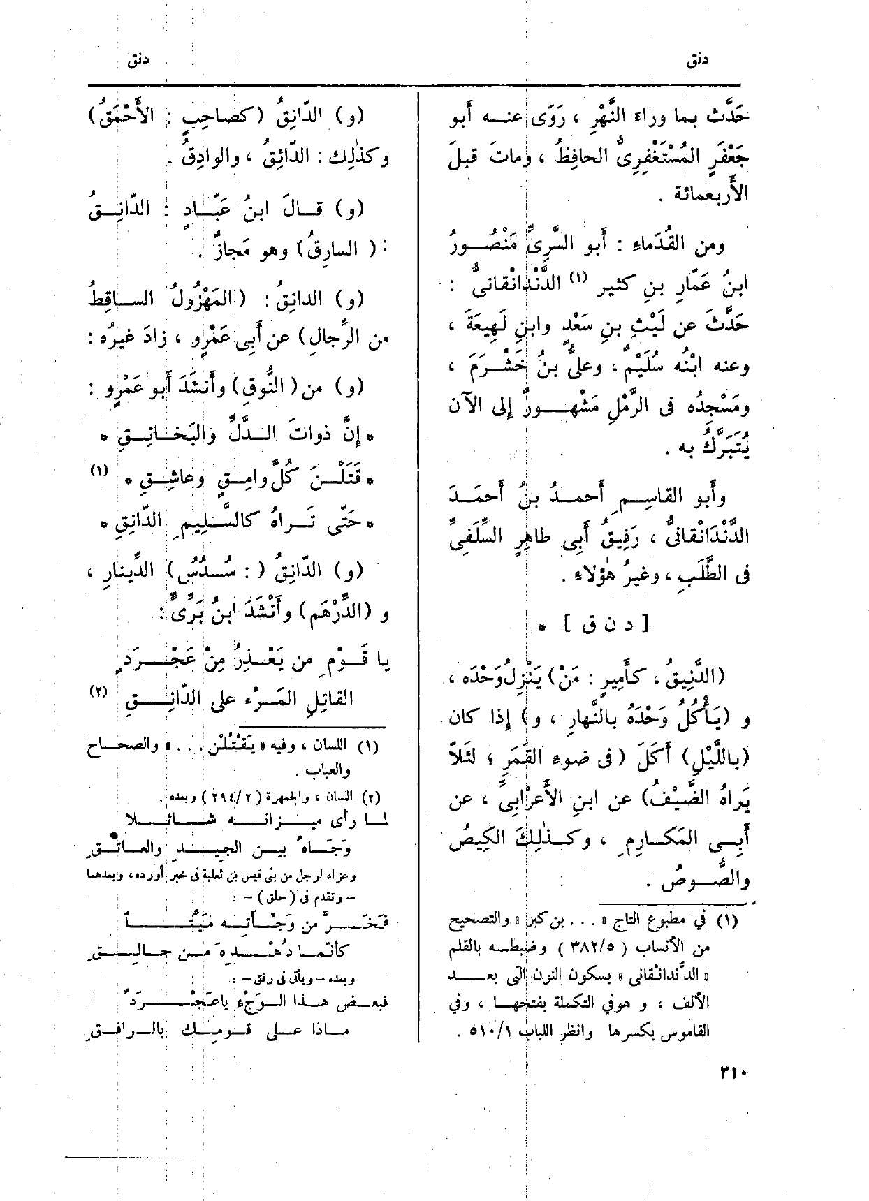 وقالَ ابنُ عَبّادٍ: الدّانقُ: السارِقُ وَهُوَ مَجازٌ. والدانِق: المَهْزُولُ الساقِطُ من الرِّجالِ عَن أَبِي عَمْرٍ وزادَ غيرُه: وَمن النوقِ وأنشَدَ أَبو عَمْروٍ: إنَّ ذواتَ الدَّلِّ والبَخانِقِ قَتَلْنَ كلَّ وامِقٍ وعاشِقِ حَتّى تَراة كالسَّلِيم الدّانِقِ والدّانِقُ: سُدُسُ الدِّينارِ، والدِّرْهَم وأَنْشَدَ ابنُ بَرَيٍّ: