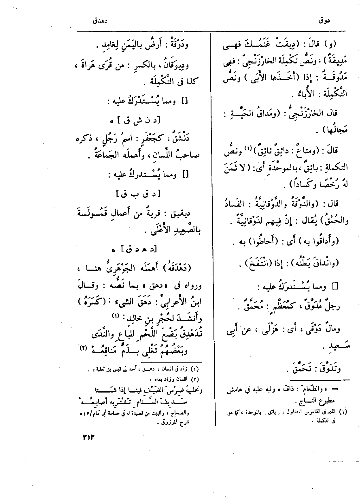 } وانْداقَ بَطْنُه: إِذا انْتَفَخَ. وَمِمَّا يُسْتَدرَكُ عَلَيْهِ: رجلٌ {مُدَوَّقٌ، كمُعَظَّم: مُحَمَّقّ. ومالٌ} دَوْقَى، أَي: هَزْلَى، عَن أبِي سَعيدِ. {وتَدَوَّقَ: تَحَمِّقَ.} ودَوْقَةُ: أَرضٌ باليَمَنِ لِغامِدِ.! ودِيوَقَانُ، بالكسرِ: من قُرَى هَراةَ، كَذَا فِي التَّكْمِلَة. وَمِمَّا يُسْتدْرَكُ عَلَيْهِ: