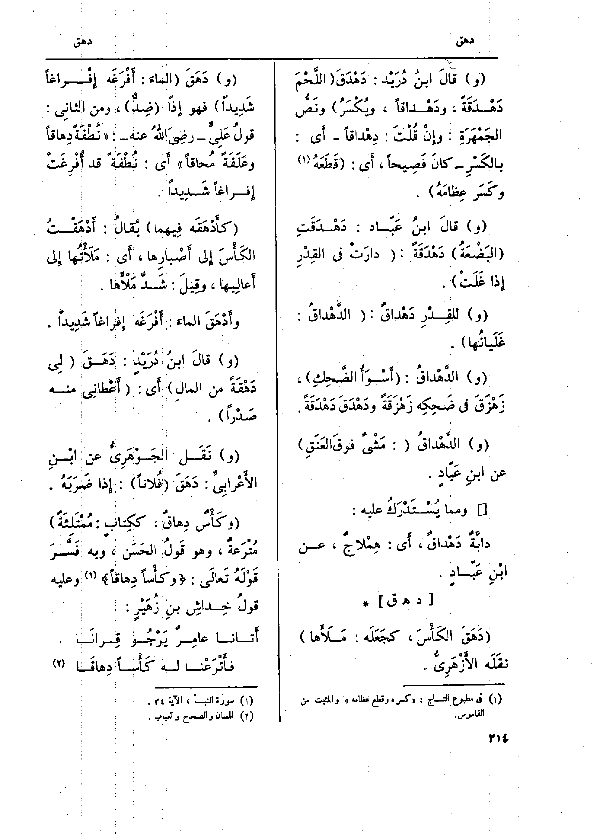 دَهَقَ الكَأسَ، كجَعَلَه: مَلأها نقَلَه الأزْهَرِيُّ. ودَهَقَ الماءَ: أَفْرَغَه إِفْراغاً شَدِيداً فَهُوَ إِذاً ضِدُّ، وَمن الثانِي: قولُ عَلِي رضِيَ اللهُ عَنهُ: نُطْفَةً دِهاقاً وعَلَقَةً مُحاقاً أَي: نُطْفَةً قد أفْرِغَتْ إِفراغاً شَدِيداً. كأدْهَقَه فِيهما يُقالُ: أدْهَقْتُ الكَاسَ إِلى أَصبارِها، أَي: مَلأتُها إِلى أعالِيها، وقِيلَ: شَدَّ مَلأها. وأَدْهَقَ الماءَ: أفْرَغّه إفراغاً شَدِيداً. وقالَ ابنُ دُرَيْدٍ: دَهَقَ لِي دَهْقَهًّ من المالِ أَي: أعْطانِي مِنْهُ صَدْرًا. ونَقَل الجَوْهَرِي عَن ابْنِ الأعْرابِيِّ: دَهَقَ فُلاناً: إِذا ضَرَبَهُ. وكَأسٌ دِهاقٌ، ككِتابٍ: مُمْتَّلئَةٌ مُتْرَعةٌ، وَهُوَ قَولُ الحَسَن، وَبِه فَسِّرَ قَوْلَهُ تَعالَى: وكأْساً دِهاقاً وَعَلِيهِ قولُ خِداشِ بنِ زُهَيْرٍ: