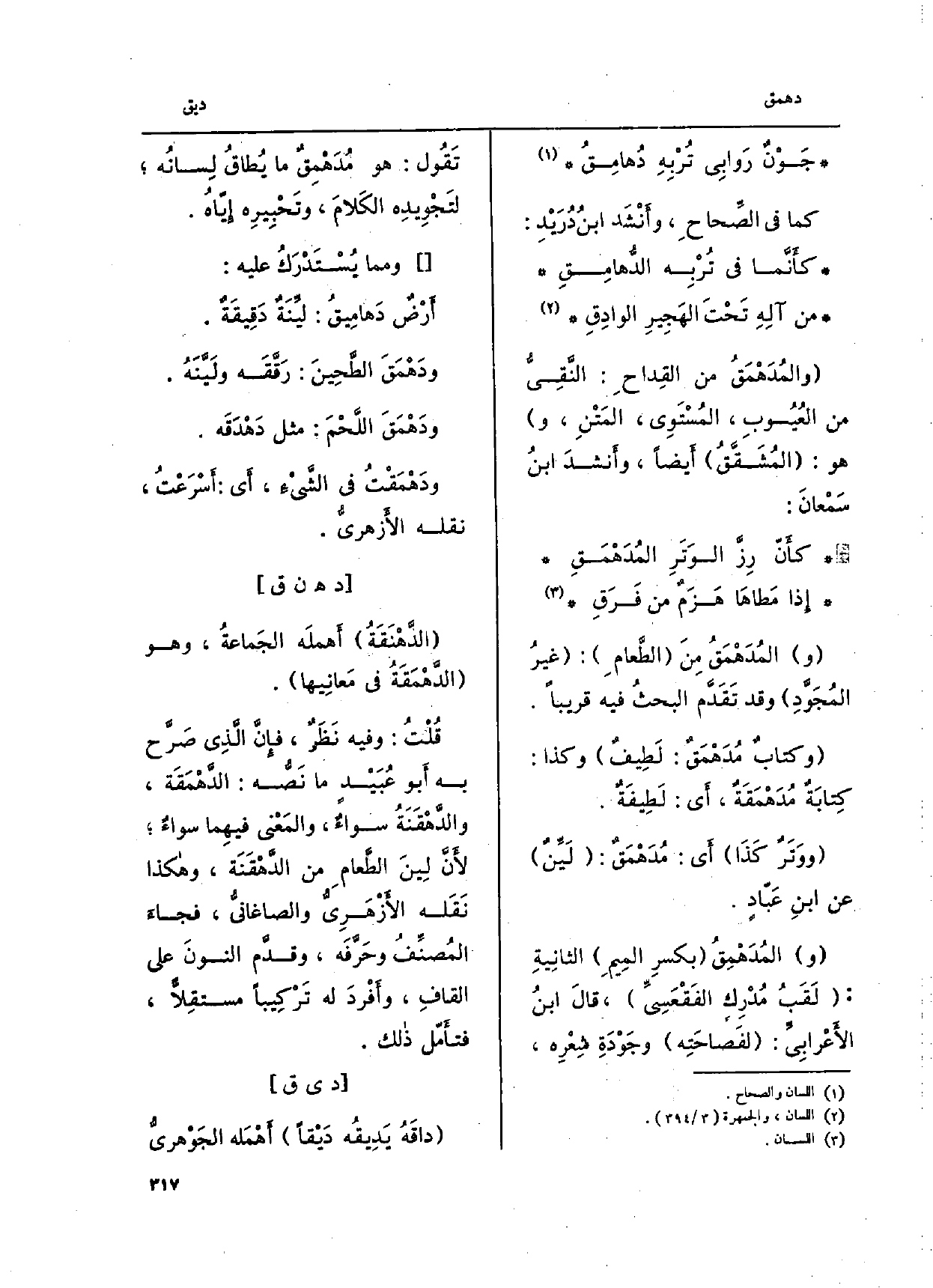 كأنّ رِزَّ الوَتَرِ المُدَهْمَقِ إِذا مَطاهَا هَزَمٌ من فَرَقِ والمُدَهْمَقُ مِنَ الطَّعام: غيرُ المُجَوَّدِ وَقد تَقَدَّم البحثُ فِيهِ قَرِيبا. وكتابٌ مُدَهْمَقٌ: لَطِيفٌ وَكَذَا: كِتابَةٌ مُدَهْمَقَةٌ، أَي: لَطِيفَةٌ. ووَتَرٌ كَذَا أَي: مُدَهْمَقٌ: لَيِّنٌ عَن ابنِ عَبّادٍ. والمُدَهْمِقُ بكسرِ المِيم الثانِيةِ: لَقَبُ مُدْرِك الفَقْعَسِيِّ، قالَ ابنُ الأعْرابي: لفَصاحَتِه وجَوْدَةِ شِعْرِه، تقَول: هُوَ مُدَهْمِقٌ مَا يُطاقُ لِسانُه، لتَجْوِيدِه الكَلامَ، وتَحْبِيرِه إيّاهُ. وَمِمَّا يُسْتَدْرَكُ عَلَيْهِ: أَرْضٌ دَهامِيقُ: ليَّنَةٌ دَقِيقَة.