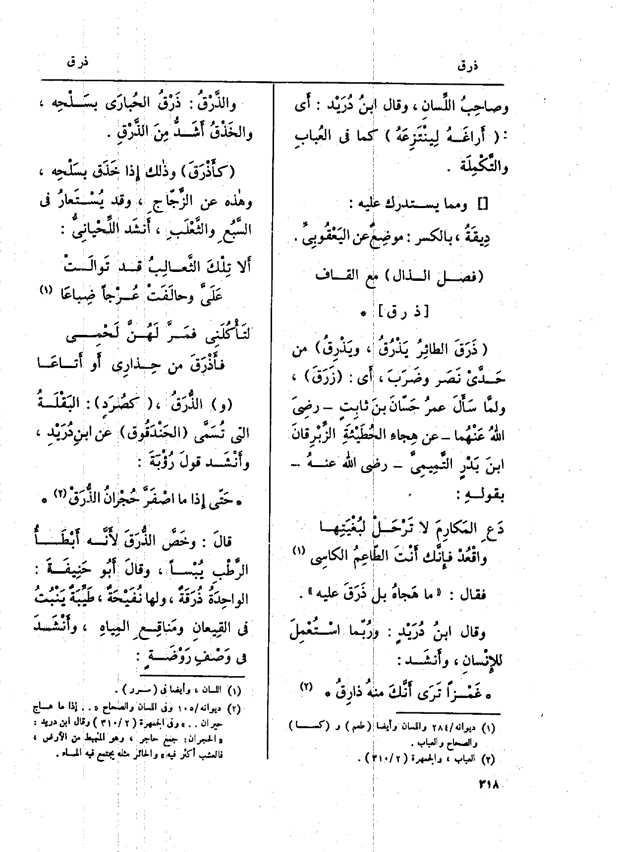 فَقَالَ: مَا هَجاهُ بل فَرَقَ عَلَيْهِ. وَقَالَ ابنُ دُرَيدٍ: ورُبّما اسْتُّعْمِلَ للإنْسانِ، وأنشَد: غَمزًا تَرَى أَنَّكَ منهُ ذارِقُ والذَّرْقُ: ذَرْقُ الحُبارَى بسَلْحِه، والخَذْقُ أَشَدُّ مِنَ الذَّرْقِ. كأذْرَقَ وَذَلِكَ إِذا خَذَق بسَلْحِه، وَهَذِه عَن الزَّجاج، وَقد يُستَعارُ فِي السَّبُع والثَّعْلَبِ، أَنشَد اللِّحْيانِي: