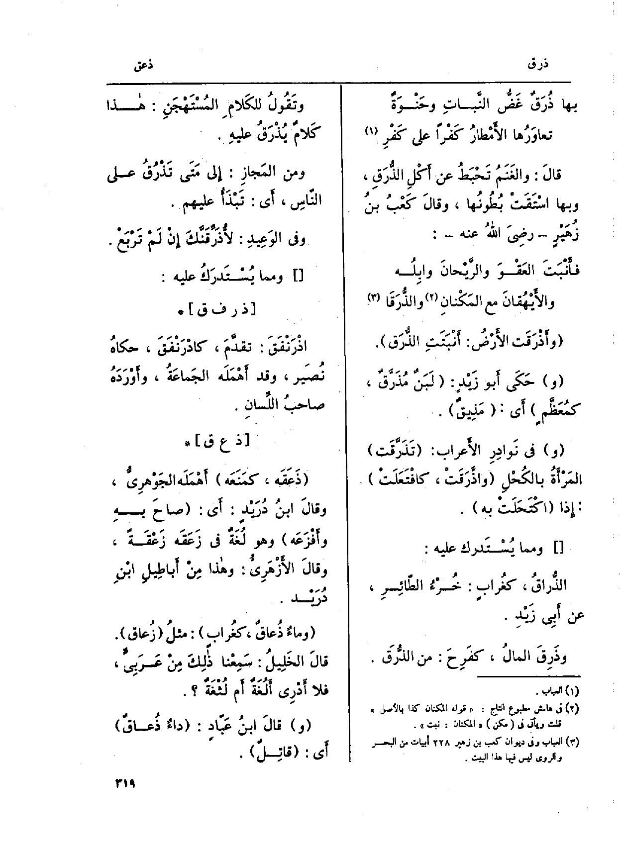 قالَ: والغَنَمُ تَحْبَطُ عَن أَكْلِ الذُّرَقِ، بهَا اسْتَقَتْ بُطُونُها، وقالَ كَعْبُ بنُ زهَيْرٍ رضِيَ اللهُ عَنهُ: