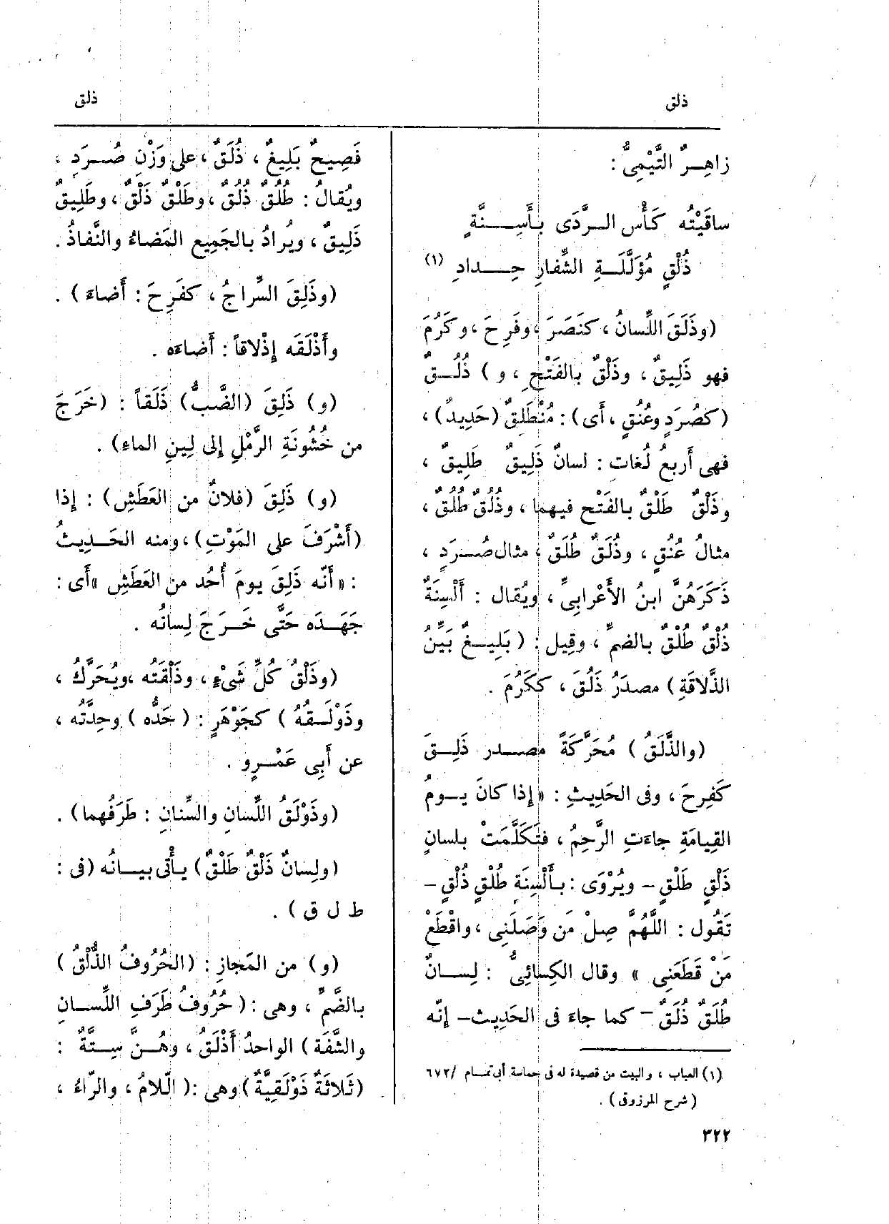 وذَلَقَ اللِّسان، كنصرَ وفَرِحَ، وكَرُمَ فَهُوَ ذَلِيقٌ، وذَلْقٌ بِالْفَتْح وذُلُق كصُرَدٍ وعُنُقَّ، أَي: مُنْطلَقٍ حَديدٌ فَهِيَ أَربعُ لُغَات: لسانٌ ذَليقٌ طَلِيقٌ، وذَلْقٌ طَلْقٌ بِالْفَتْح فيهمَا، وذُلقٌ طُلْقٌ، مثالُ عُنُقٍ، وذُلَقٌ طُلْقٌ، مِثَال صُردٍ، ذَكَرَهُنَ ابنُ الأَعرابِيَ، ويُقال: أَلْسِنَةٌ ذُلْقٌ طُلْقٌ بالضمِّ، وقِيل: بَلِيغٌ بَيَنُ الذَّلاقَةِ مصدَرُ ذَلُقَ، ككرُمَ. والذَّلَق مُحَرَّكَةً مصدر ذَلِقَ كَفِرحَ، وَفِي الحَدِيثِ: إَذا كانَ يومُ القِيامَةِ جاءَتِ الرَّحِمُ، فتَكلمَتْ بلسانٍ ذَلْقٍ طَلْقٍ ويُروى: بأَلْسنَةِ طلْقٍ ذُلْقٍ تَقُول: اللَّهُمَّ صِل) مَن وَصَلَنِي، واقْطَعْ مَنْ قَطَعَنِي وَقَالَ الكِسائِيُّ: لِسان طُلَقٌ ذُلَقٌ كَمَا جاءَ فِي الحديثِ إِنّه فصِيحٌ بَلِيغٌ، ذُلَق، على وَزْنِ صُرَد ويقّالُ: طُلُقٌ ذُلُقٌ، وطَلْقٌ ذَلْقٌ، وطَلِيَق ذَلِيقٌ، ويُرادُ بالجَمِيع المَضاءُ والنَّفاذُ. وذَلِقَ السِّراجُ، كفَرِحَ: أَضاءَ. وأَذْلَقَه إِذْلاقاً: أَضاءّه. وذَلِقَ الضَّبُّ ذَلَقاً: خَرَجَ من خُشُونَةِ الرملِ إِلى لِينِ الماءَ. وذَلِقَ فلانٌ من العَطَشِ: إِذا أَشْرَفَ على المَوْتِ، وَمِنْه الحَدِيثُ: أَنّه ذَلِقَ يومَ أحُد من العَطَش أَي: جَهَدَه حَتىَّ خَرَجَ لِسانُه.
