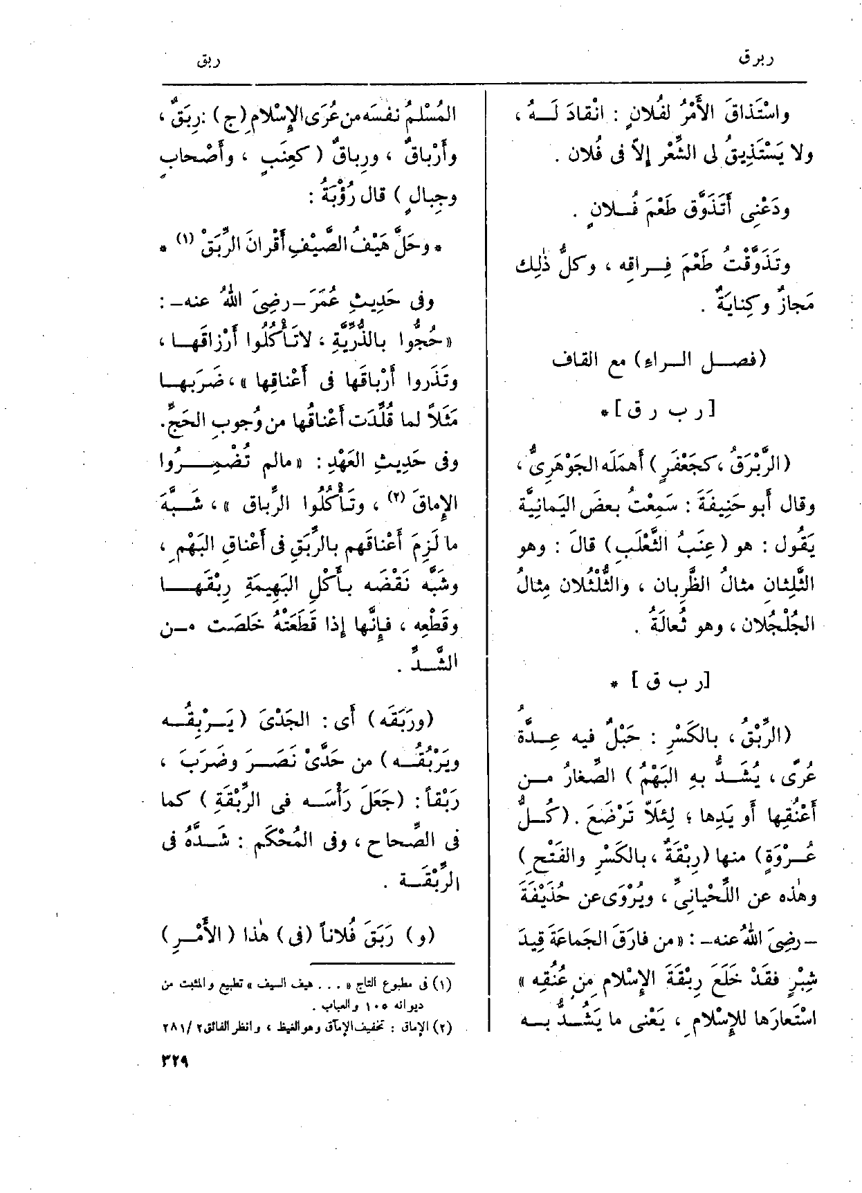 الرِّبْقُ، بالكَسْرِ: حَبْل فِيهِ عِدة عُرىً، يُشَدُّ بهِ البَهْمُ الصِّغارُ من أَعْنُقِها أَو يَدِها، لِئلاّ تَرْضَعَ. كُلُّ عُرْوَةٍ مِنْهَا رِبْقَةٌ، بالكَسْرِ والفَتْح وَهَذِه عَن اللِّحْيانيِّ، ويُرْوَى عَن حُذَيْفَةَ رضِيَ اللهُ عَنهُ: من فارقَ الجَماعَةَ قِيدَ شِبْرٍ فقَدْ خَلَعَ رِبْقَةَ الإِسْلام مِن عُنُقِه استعارَها للإِسْلام، يَعني مَا يَشُدُّ بِهِ المُسْلمُ نفسَه من عُرَى الإِسْلام ج: رِبَقٌ، وأَرْباقٌ، ورِباقٌ كعِنَبٍ، وأَصْحابٍ وجِبالٍ قَالَ رؤبَةُ: وحَل هَيْفُ الصَّيفِ أَقْرانَ الرِّبَقْ وَفِي حَدِيثِ عُمَرَ رضِيَ اللهُ عَنهُ: حجوُّا بالذُّرِّيَّةِ لَا تَأْكُلُوا أرْزاقَها، وتَذَروا أَرْباقَها فِي أَعْناقِها، ضَرَبها مَثَلاً لما قُلِّدَت أَعْناقُها من وُجوبِ الحَجِّ. وَفِي حَدِيثِ العَهْدِ: مالم تُضمِرُوا الإماقَ، وتَأكُلُوا الرِّباق، شَبَّهَ مَا لَزِمَ أَعْناقَهم بالرِّبَقِ فِي أَعْناقِ البَهْم، وشَبَّه نَقْضَه بأكلِ البَهِيمَةِ رِبْقَها وقَطْعِه، فإِنها إِذا قَطَعَتْهُ خَلصَت من الشَّدّ. ورَبَقَه أَي: الجَدْيَ يَرْبِقُّه ويَربُقُه من حَدَّىْ نَصَرَ وضَرَبَ، رَبْقاً: جَعَلَ رَأسهَ فِي الرِّبْقَةِ كَمَا فِي الصِّحاح، وَفِي المُحْكَم: شَدَّهُ فِي الرِّبْقَة.