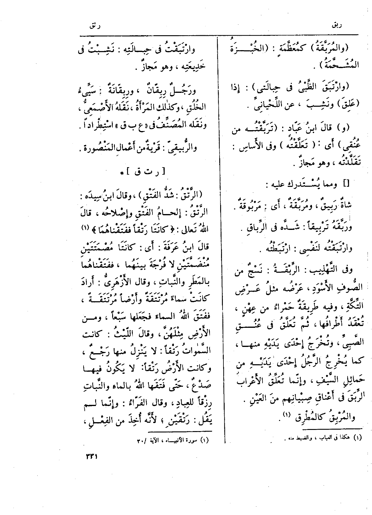 الرَّتقُ: شَدُّ الفَتْقِ، وقالَ ابنُ سِيدَه: الرَّتْق: إِلحامُ الفَتْقِ وإِصْلاحُه، قالَ اللهُ تَعالى: كانَتَا رَتْقاً ففَتَقْناهُمَا قالَ ابنُ عَرَفَةَ: أَي: كانَاتَا مُصْمَتَتَيْنِ مُنْضَمَّتَيْنِ لَا فُرْجَةَ بينَهُما، ففَتَقْناهُما بالمَطَرِ والنَّباتِ، وَقَالَ الأَزهَرِيُّ: أَرادَ كانَتْ سَمَاء مُرْتَتَقَةً وأَرْضاً مُرْتَتَقَةً، ففَتَقَ اللهُ السماءَ فجَعَلها سَبْعاً، وَمن الأَرْضِ مِثْلَهُنَّ، وقالَ اللّيْثُ: كَانَت السَّمواتُ رَتْقاً: لَا يَنزِلُ مِنْهَا رَجْعٌ، وَكَانَت الأَرْضُ رَتْقاً: لَا يَكُونُ فِيهَا صَدْعٌ، حَتّى فَتَقَها اللهُ بالماءَ والنَّباتِ رِزْقاً للعِبادِ، وَقَالَ الفَرّاءُ: وإِنّما لم يَقُل: رَتْقَيْن، لأَنَّه أُخِذَ من الفِعْلِ،