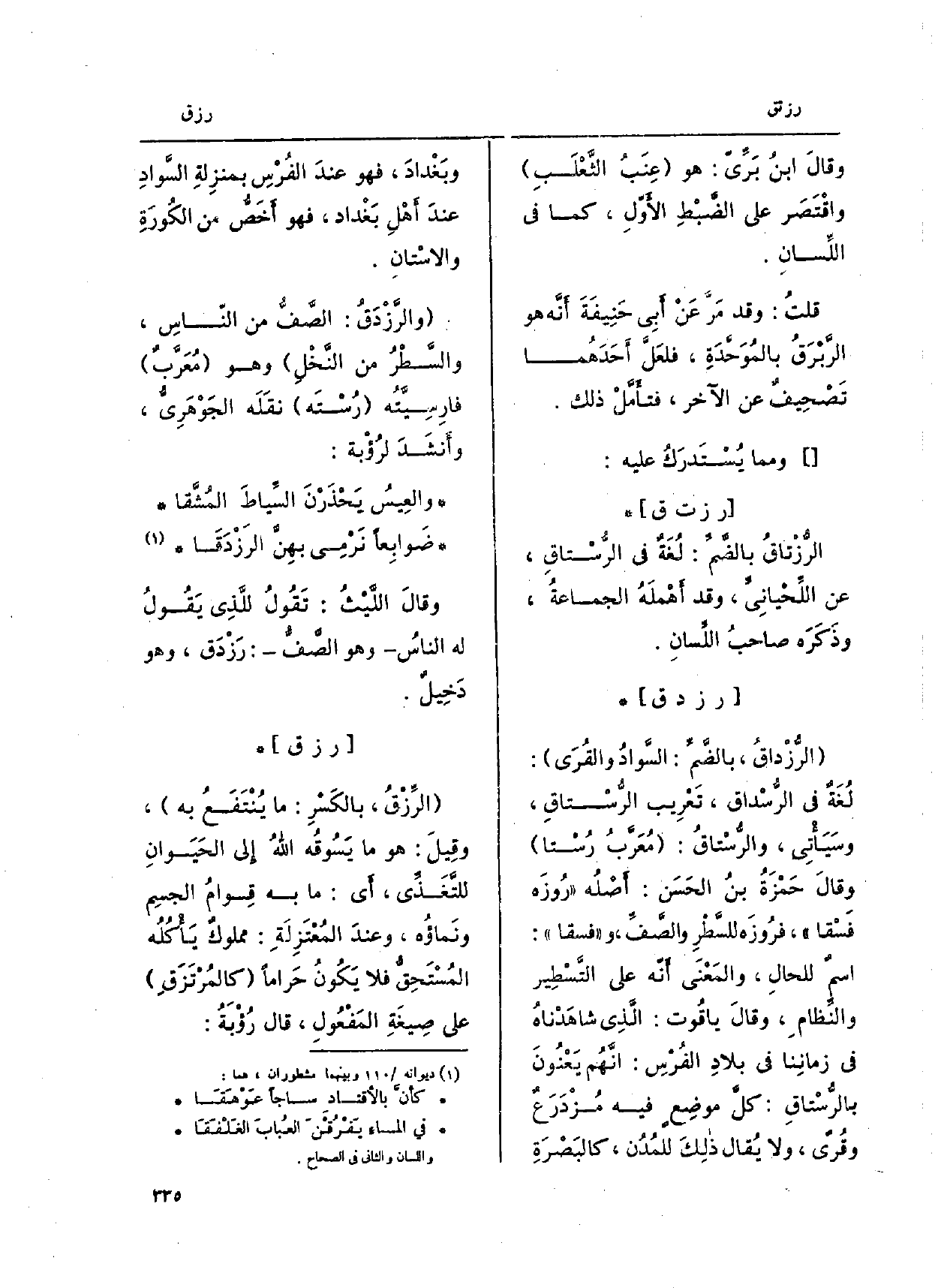والرَّزْدَق: الصَّفُّ من الناسِ، والسَّطْرُ من النَّخْلِ وَهُوَ مُعَرَّبٌّ فارِسيَّته رُسْتَه نقَلَه الجَوْهَرِيُّ، وأَنشَدَ لرُؤْبة: والعِيسُ يَحْذَرْنَ السِّياطَ المُشَّقا ضَوابِعاً نَرْمِي بهِن الرَزْدَقَا وقالَ اللَّيْثُ: تَقُولُ للَّذِي يَقُولُ لَهُ الناسُ وَهُوَ الصَّفُّ: رَزْدَق، وَهُوَ دخِيلٌ.