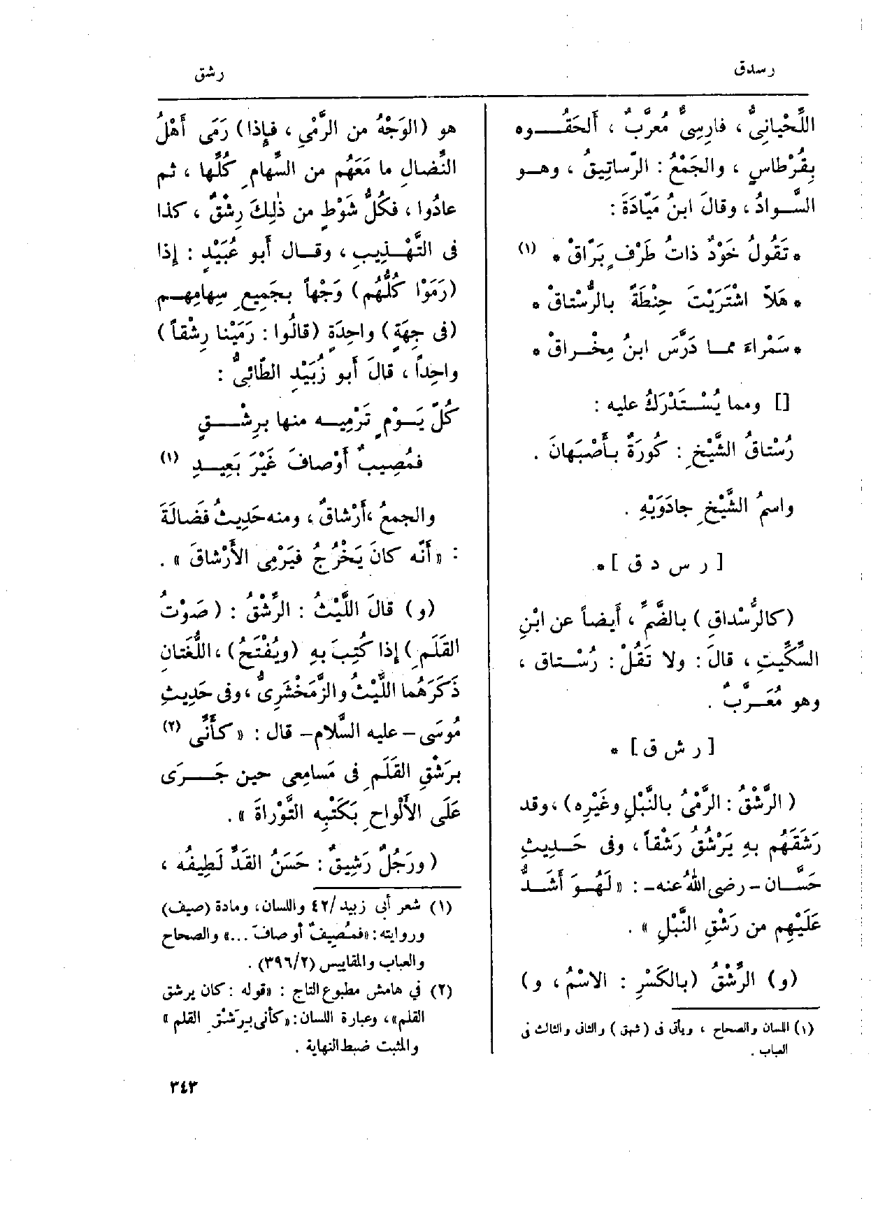 اللِّحيانِيُ، فارسيٌّ مُعرَّبٌ، أَلحَقُوه بِقُرطاسٍ، والجَمع: الرّساتِيقُ، وَهُوَ السَّوادُ، وقالَ ابنُ مَيّادَةَ: تَقُولُ خَوْدٌ ذَات طَرْفٍ بَرّاقْ هَلاّ اشْترَيْتَ حِنْطَةً بالرُّستاقْ سَمْراءَ مِمَّا دَرَّسَ ابنُ مِخْراقْ وَمِمَّا يُسْتَدْرَكُ عَلَيْهِ: رُسْتاق الشَّيْخِ: كورَة بأصْبَهانَ. واسمُ الشَّيخَ جادَوَيْهِ.