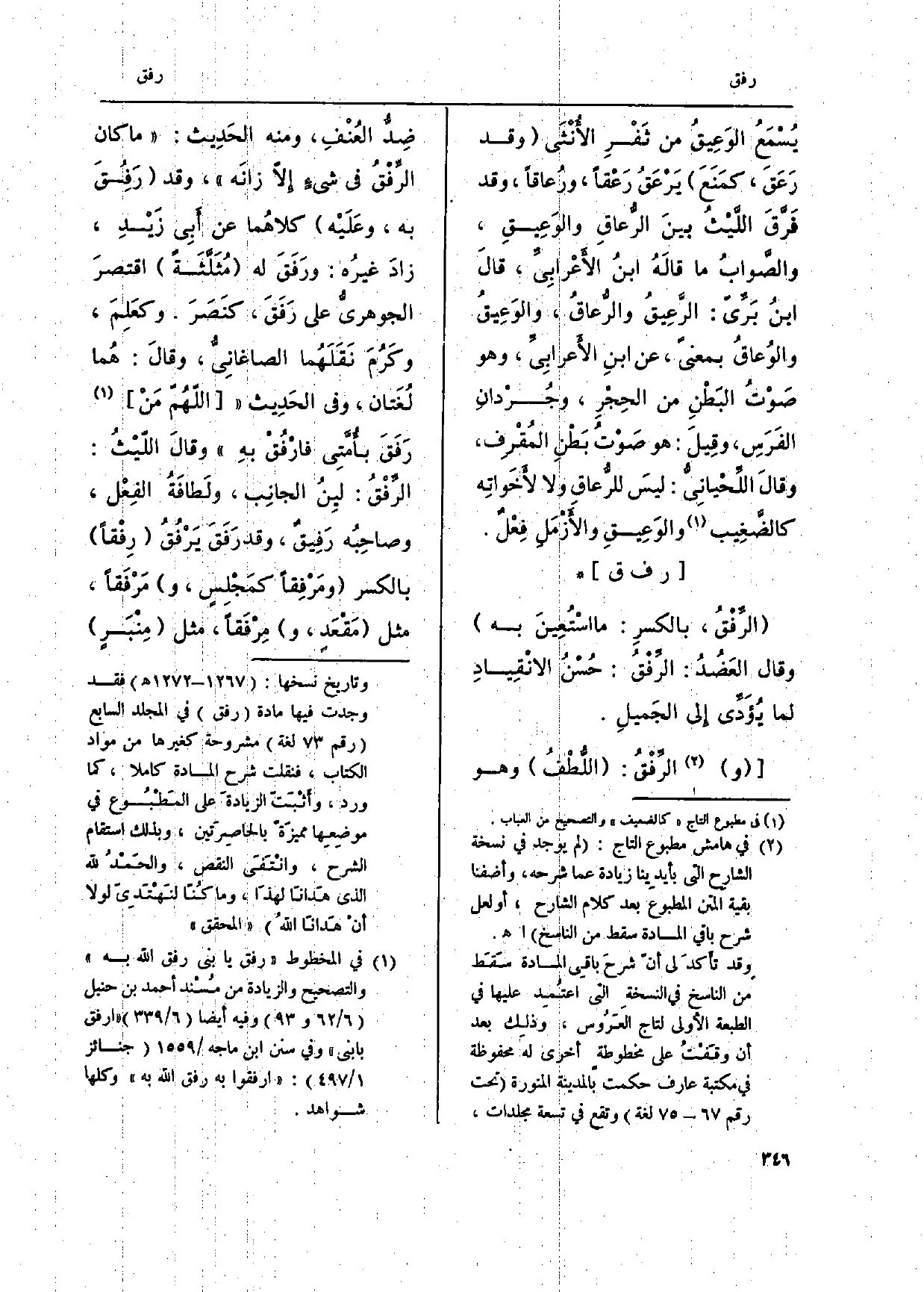 والرِّفق: اللُّطْفُ وَهُوَ ضِدُّ العُنْفِ، وَمِنْه الحَدِيث: مَا كَانَ الرِّفْقُ فِي شيءٍ إِلا زانَه، وَقد رَفُقَ بِهِ، وعَلَيْه كلاهُما عَن أَبِي زَيْدِ، زادَ غيرُه: ورَفَقَ لَهُ مُثَلَّثَةً اقْتصرَ الجوهريُّ على رَفَقَ، كنَصَرَ. وكعَلِمَ، وكرُمَ نَقَلَهُما الصاغانِيُّ، وقالَ: هما لُغَتان، وَفِي الحَدِيث: اللهُمّ مَنْ رَفَقَ بأمتِي فارْفُقْ بهِ وقالَ اللّيْث: الرِّفْقُ: ليِنُ الجانِب، ولَطافَةُ الفِعْل، وصاحِبُه رَفِيقٌ، وَقد رَفقَ يَرْفُق رِفقاً بِالْكَسْرِ ومَرْفِقاً كمَجْلسٍ، ومَرفَقاً مثل مَقْعَدِ، ومِرفَقاً، مثل مِنبرٍ