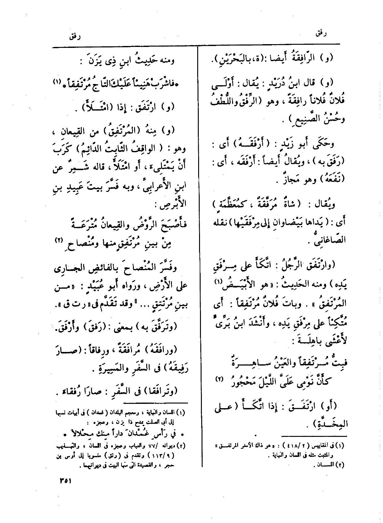 والرافِقةُ أَيْضا: ة، بالبَحْرَيْنِ. وَقَالَ ابْن دُرَيْدٍ: يُقالُ: أَوْلَى فُلانٌ فُلاناً رافِقَةً، وَهُوَ الرِّفْقُ واللُّطْفُ وحُسْنُ الصَّنِيعَ. وحَكَى أَبو زَيْدٍ: أَرْفَقَهُ أَي: رَفَقَ بِهِ، ويُقالُ أَيضاً: أَرْفَقَه، أيى: نَفَعَهُ وَهُوَ مَجازٌ. وَيُقَال: شاةٌ مُرَفقَةٌ، كمُعَظَّمَة أَي: يَداها بَيْضاوانِ إِلى مِرْفَقَيْها نَقله الصّاغانِيُّ. وارْتَفَق الرَّجُلُ: اتَّكَأَ على مِرْفَقِ يَدِه وَمِنْه الحَدِيثُ: هُوَ الأَبْيَضُ المُرْتَفِقُ. وباتَ فُلانٌ مُرْتَفِقاً: أَي مُتكِئاً على مِرْفَقِ يَدِه، وأَنْشَدَ ابنُ بَرِّيٍّ لأَعْشَى باهِلَةَ: