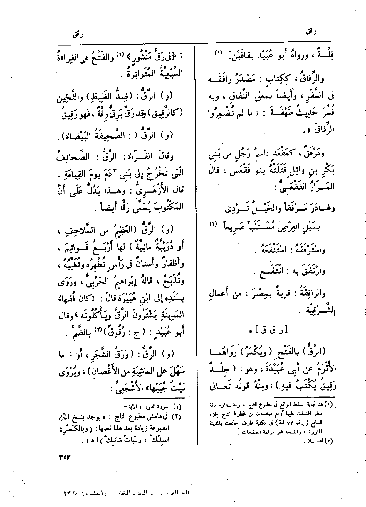 {الرَّقُّ بالفَتح ويُكْسَرْ روَاهُما الأثْرمُ عَن أبِي عُبَيدةَ، وَهُوَ: جِلْدٌ} رَقِيق يكْتبُ فيهِ، ومِنْهُ قولُه تَعالى: فِي {رَقٍ مَنْشورٍ، والفَتْحُ هى القِراءة السَّبْعِيَّةُ المُتَواتِرةُ. والرَّقُّ: ضِدُّ الغَلِيظِ والثَّخِين} كالرَّقِيق وَقد {رَقَّ} يَرِقُّ {رِقَّةُ، فَهُوَ} رَقِيق. (و) {الرَّقُّ: الصَّحِيفَةُ البَيْضاءُ. وقالَ الفَرّاءُ: الرَّقُّ: الصَّحائِفُ الّتي تَخْرُجُ إِلَى بَنِي آدَمَ يومَ القِيامَةِ، قَالَ الأَزْهَرِي: وَهَذَا يَدُلُّ عَلَى أَن المَكتوبَ يُسَمَّى} رَقاً أَيضاً. (و) {الرِّقُّ العَظِيم من السَّلاحفِ، أَو دُوَيْبةٌ مائِيةٌ لَهَا أَرْبَعُ قَوائِمَ، وأَظفار وأسنانٌ فِي رَأس تُظْهِرُه وتُغَيبهُ، وتُذْبَحُ، قالهُ إِبْراهيمُ الحَرْبِيُّ، ورَوى بسَنَدِه إِلى ابْنِ هُبَيْرَة قالَ: كَانَ فُقهاءُ المَدِينَةِ يَشْتَرُونَ الرَّقَّ ويأكلُونَه وَقَالَ أَبُو عُبَيد: ج:} رُقُوقٌ بالضَّمِّ. (و) ! الرَّقُّ: وَرَقُ الشَّجَرِ، أَو: مَا سَهُل على الماشِيَةِ من الأغْصانِ، ويُرْوَى بَيْت جُبَيْهاءَ الأشْجَعيِّ: