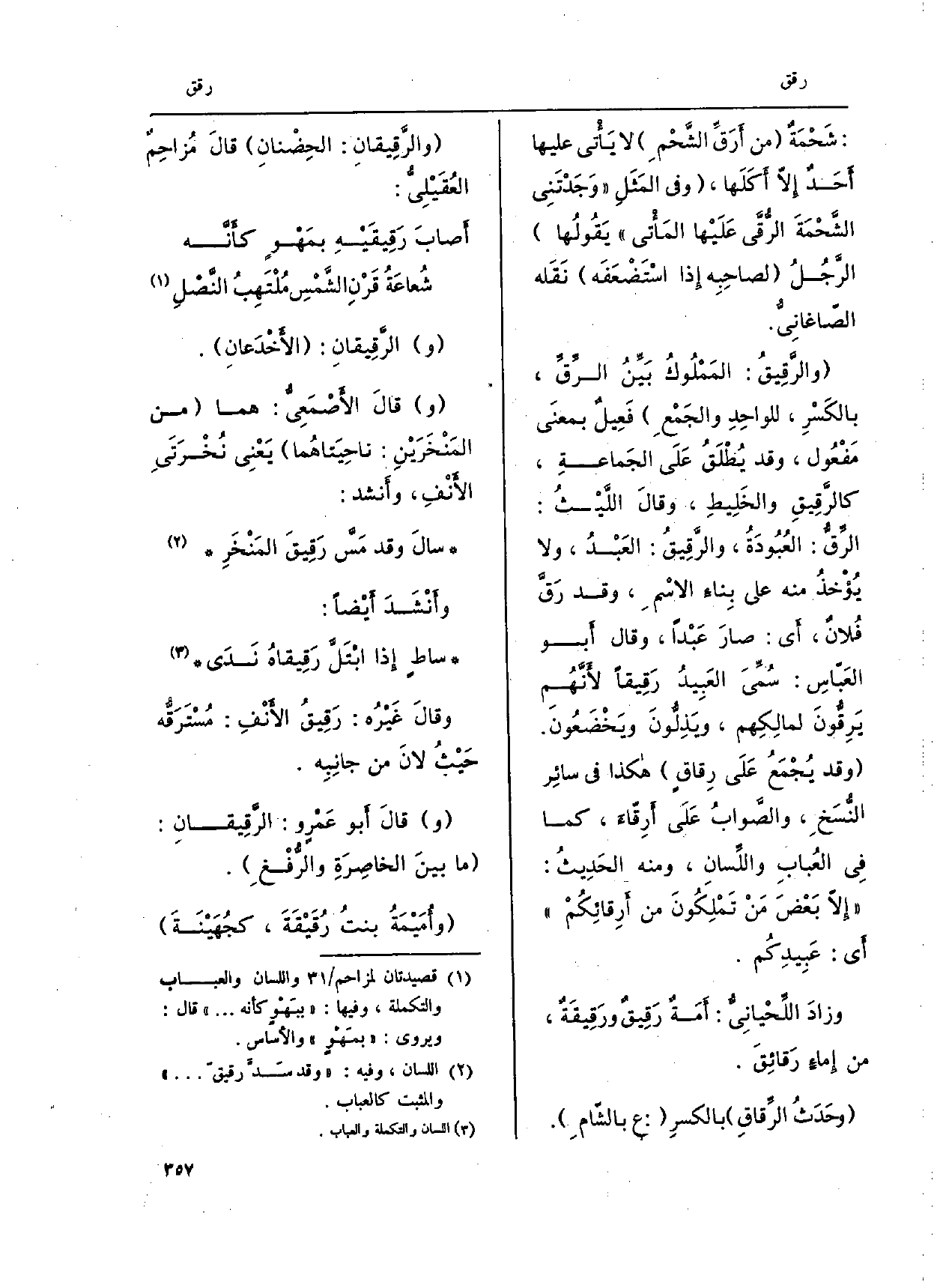 (و) } الرَّقِيقّانِ: الأَخْدَعانِ. وقالَ الأَصْمَعِي: هما من المَنْخَرَيْنِ: ناحِيَتاهُما يَعْنِي نُخْرَتَيِ الأَنف وَأنْشد: سالَ وَقد مَسَّ {رَقِيقَ المَنْخَرِ وأَنْشَدَ أَيْضاً: ساطٍ إِذا ابْتَلَّ} رَقِيقاهُ نَدَى وقالَ غَيْرُه: {رَقِيقُ الأَنْفِ: مُسْتَرَقُّه حَيْثُ لانَ من جانِبِه. وقالَ أَبُو عَمرٍ و:} الرَّقيقانِ: مَا بينَ الخاصِرَةِ والرُّفْغ.)
