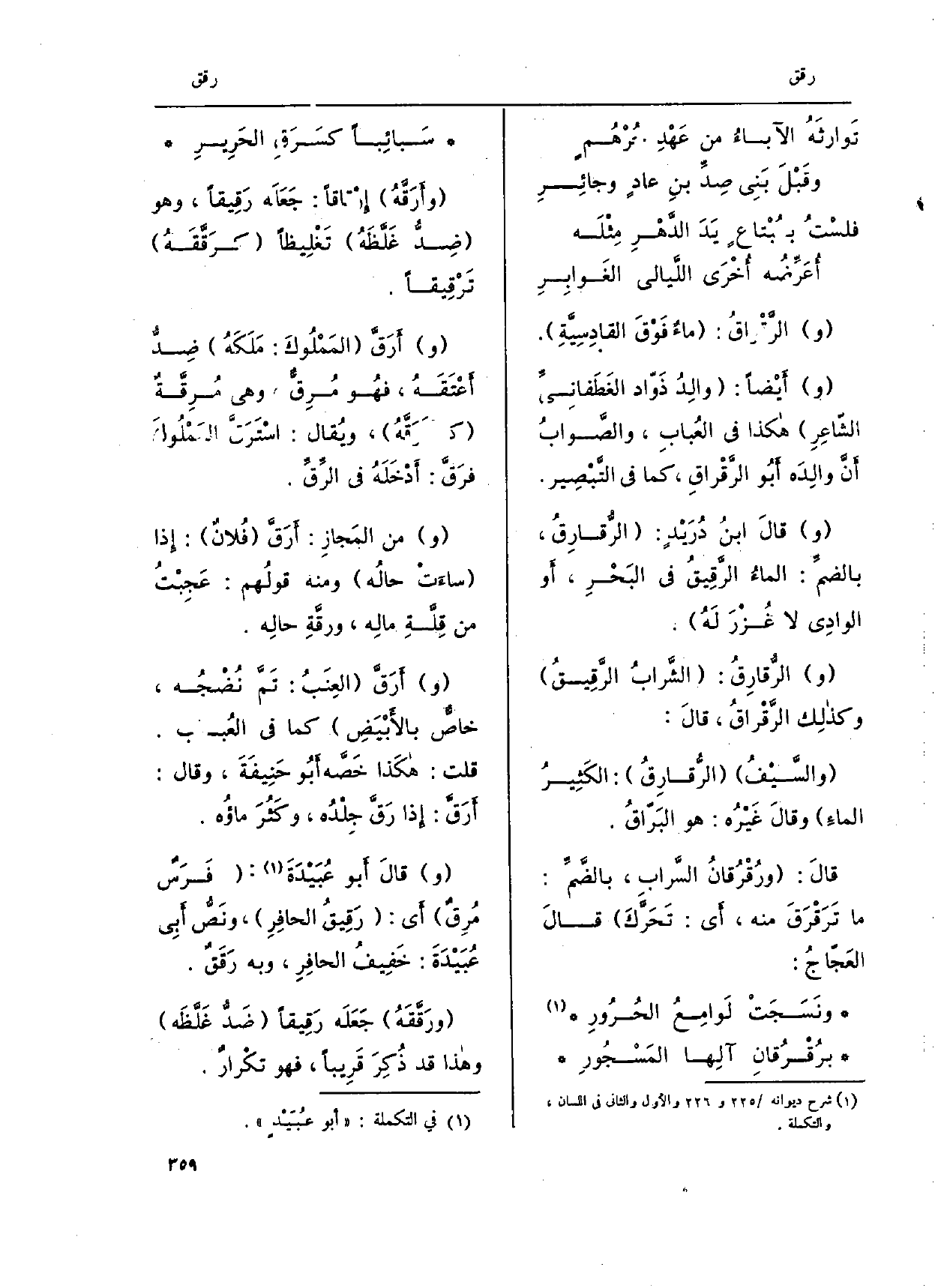 ونَسَجَتْ لَوامِعُ الحُرُورِ برُقْرُقانِ آلِها المَسْجُورِ سَبائِباً كسَرَقِ الحَرِيرِ {وأرَقَّهُ} إِرْقاقاً: جَعَلَه {رَقِيقاً، وَهُوَ ضِدُّ غَلَّظَهُ تَغْلِيظاً} كرَقَّقَة {تَرْقِيقاً. (و) } أرَقَّ المَمْلُوكَ: مَلَكَهُ ضِدّ أعْتَقَهُ، فهُو {مُرِقٌّ، وَهِي} مُرِقةٌ {كاسْتَرَقَّهُ، ويُقال:} اسْتَرَقَ المَمْلُوكَ فرَقَّ: أدْخَلَهُ فِي الرِّقِّ. وَمن المَجازِ: {أَرَقَّ فُلان: إِذا ساءَت حالُه وَمِنْه قولُهم: عَجِبْتُ من قلَّةِ مالِه، ورقَّةِ حالِه. (و) } أَرَقَّ العِنَبُ: تَمَّ نُضْجُه، خاصٌّ بالأَبْيَضِ كَمَا فِي العُباب. قلت: هكَذا خَصَّه أَبُو حَنِيفَةَ، وَقَالَ: {أَرَقَّ: إِذا} رَقَّ جِلْدُه، وكَثُرَ ماؤُه. وقالَ أَبو عُبَيْدَةَ: فَرَسٌ مُرِقٌ أَي: {رَقِيقُ الحافِرِ، ونَصُّ أبِي عُبَيْدَةَ: خَفِيفُ الحافِرِ، وَبِه رَقَقٌ.} ورَقَّقَهُ جَعَلَه! رَقِيقاً ضَدُّ غَلَّظَه وَهَذَا قد ذُكِرَ قَرِيباً، فَهُوَ تكْرارٌ.
