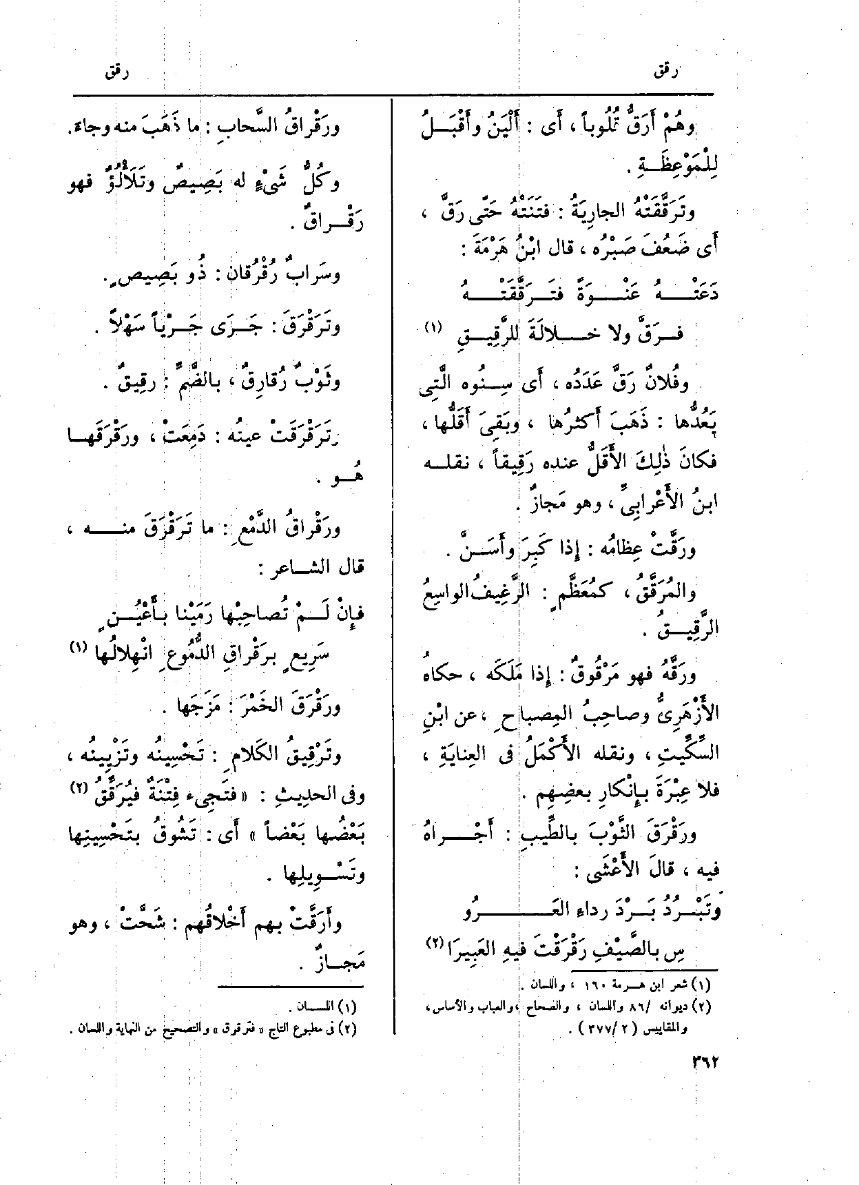 } ورَقْرَقَ الخَمْرَ: مَزَجَها. {وتَرْقِيقُ الكَلام: تَحْسِينُه وتَزْيينُه، وَفِي الحدِيثِ: فَتجِىء فِتْنَةٌ} فيُرَقِّقُ بَعْضُها بَعْضاً. أَي: تَشُوقُ بتَحْسِينِها وتَسْوِيلِها.! وأرَقَّتْ بهم أَخلاقُهم: شّحَّتْ، وَهُوَ مَجَازٌ.