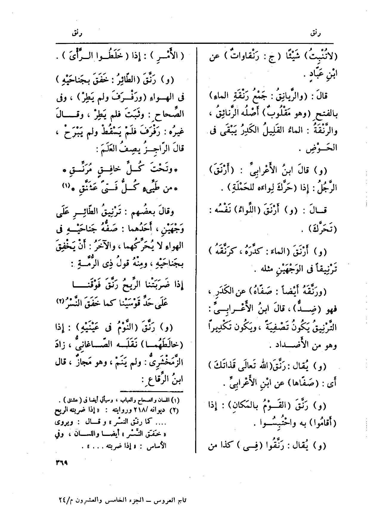 الماءَ بِالْفَتْح وَهُوَ مَقْلُوبٌ أَصْلُه الرَّنائِقُ، والرَّنْقَةُ: الماءُ القَلِيلُ الكَدِرُ يَبْقَى فِي الحَوْضِ. وقالَ ابنُ الأَعْرابِيِّ: أَرْنَقَ الرَّجُلُ: إِذا حَركَ لِواءَه للحَمْلَةِ. قالَ: وأَرْنَقَ اللِّواءُ نَفْسُه: تَحَرَّكَ. وأَرْنَقَ الماءَ: كدَّرَهُ، كرَنَّقَهُ تَرْنِيقاً فِي الوَجْهَيْنِ مثله. ورَنَّقَهُ أيْضاً: صَفّاهُ عَن الكَدَرِ، فَهُوَ ضِدٌّ، قالَ ابنُ الأَعْرابِيِّ: التَّرْنيقُ يَكُونُ تَصْفِيَة، ويَكُون تَكْدِيرًا وَهُوَ من الأَضداد. ويُقال: رَنَّقَ الله تعالَى قَذاتَكَ أَي: صَفّاها عَن ابْنِ الأَعْرابِيِّ. ورَنَّقَ القَوْمُ بالمَكانِ: إِذا أَقامُوا بِهِ واحْتُبِسُوا. ويُقال: رَنَّقُوا فِي كَذَا من الأَمْرِ: إِذا خَلطُوا الرَّأيَ. ورَنَّقَ الطّائِرُ: خَفَقَ بجَناحَيْهِ فِي الهواءَ ورَفرَفَ وَلم يَطِرْ، وَفِي الصِّحاح: وثَبَتَ فَلم يَطِرْ، وقالَ غيرُه: رَفْرَفَ فلَمْ يَسْقُطْ وَلم يَبْرَحْ، قالَ الرّاجِزُ يصِفُ العَلَمَ: وتَحْتَ كُلِّ خافِقٍ مُرَنَّقِ من طَيِّىءٍ كُلُّ فَتىً عَشَنَّقِ وقالَ بعضُهم: تَرْنِيقُ الطّائِرِ عَلَى وَجْهَيْنِ، أحَدُهما: صَفُّهُ جَناحَيْهِ فِي الهواءَ لَا يُحَرِّكُهما، والآَخَرُ: أَنْ يَخْفِقَ بجَناحَيْهِ، ومِنْهُ قولُ ذِي الرُّمَّةِ: