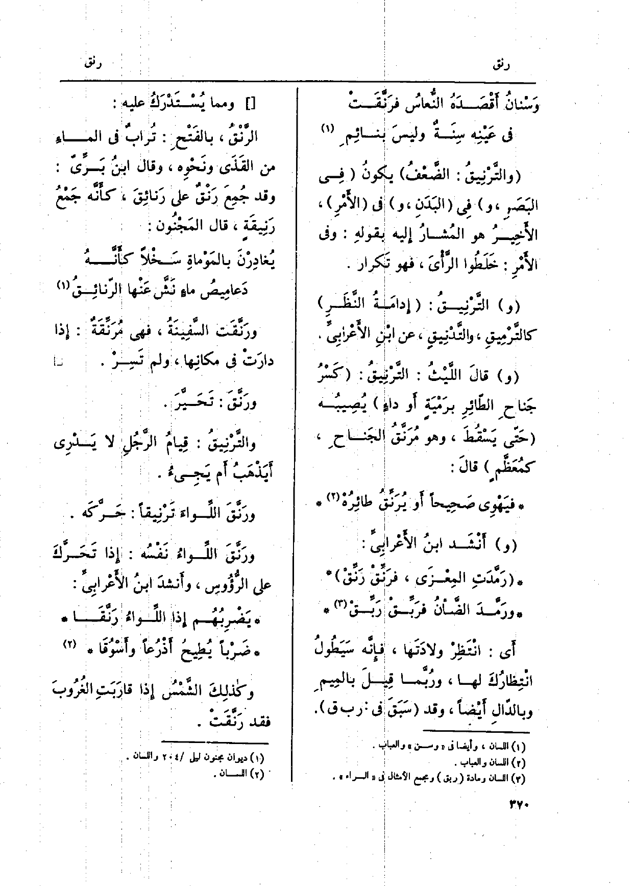ورَنَّقَت السَّفِينَةُ، فهى مُرَنِّقَة: إِذا دارَتْ فِي مكانِها، وَلم تسِرْ. ورَنَّقَ: تَحَيَّرَ. والتَّرْنِيقُ: قِيامُ الرَّجُلِ لَا يَدْرِي أَيَذْهَبُ أم يَجِىءُ. ورَنق اللِّواءَ تَرْنِيقاً: حَرَّكَه. ورَنقَ اللِّواءُ نَفْسُه: إِذا تَحَرَّكَ على الرؤوسِ، وأَنشدَ ابنُ الأعْرابِيِّ: يَضْرِبُهُم إِذا اللِّواءُ رَنَّقَا ضَرْباً يُطيْحُ أذْرُعاً وأَسْوُقَا وكذلِكَ الشَّمسُ إِذا قارَبَتِ الغُرُوبَ فقد رَنَّقَتْ.