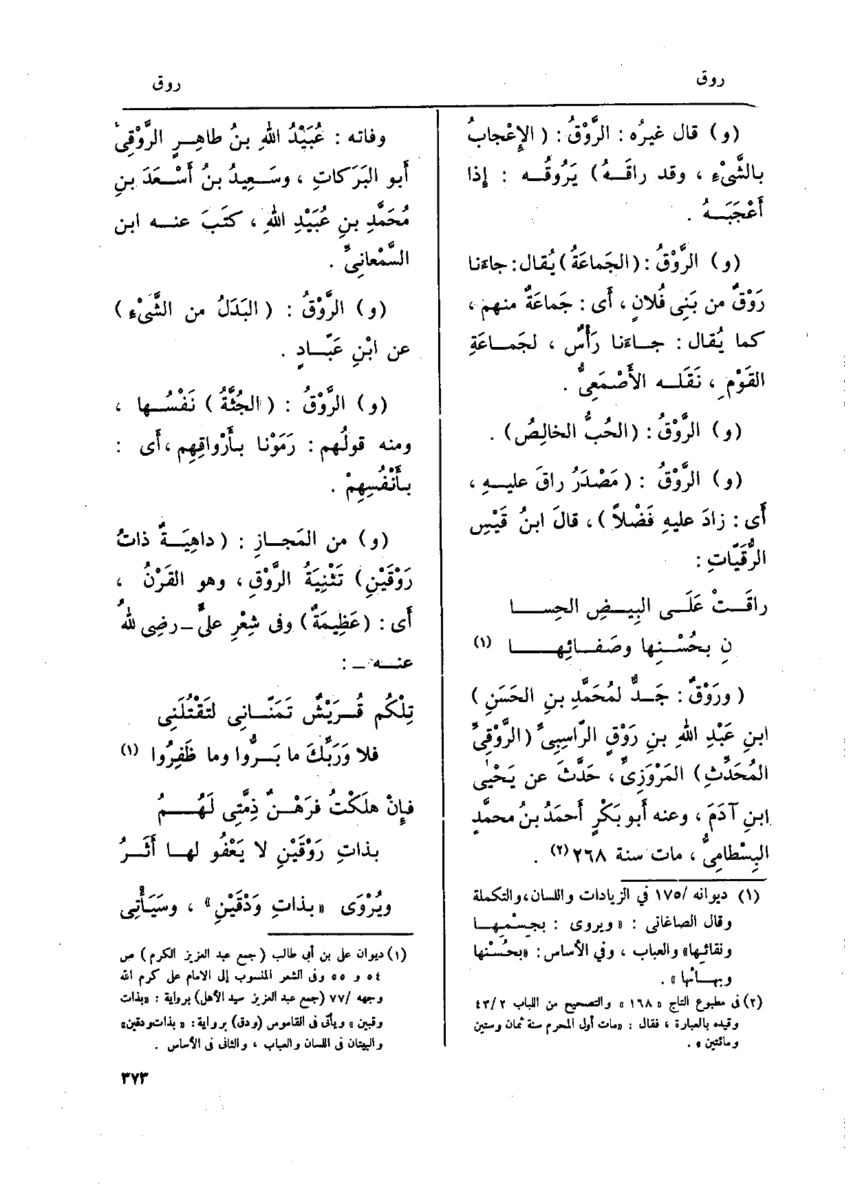 } ورَوْقٌ: جَدٌّ لمُحَمَّدِ بنِ الحَسَنِ ابنِ عَبْدِ اللهِ بنِ رَوقٍ الرّاسِبِيِّ {- الرَّوْقِيِّ المُحَدِّثِ المَرْوَزِي، حَدَّثَ عَن يَحْيى ابنِ آدَمَ، وَعنهُ أَبو بَكْرٍ أَحمَدُ بنُ محمَّدٍ البِسْطامِيُّ، مَاتَ سنة. وَفَاته: عُبَيْدُ اللهِ بنُ طاهِرٍ الرَّوْقِي أَبُو البَرَكاتِ، وسَعِيدُ بنُ أَسْعَدَ بنِ مُحَمدِ بنِ عُبَيْدِ اللهِ، كتَبَ عَنهُ ابْن السَّمْعانِيِّ. (و) } الرَّوقُ: البَدَلُ من الشَّيءْ عَن ابْنِ عَبّادٍ. والرَّوْقُ: الجُثَّةُ نَفْسُها وَمِنْه قولُهم: رَمَوْنا بأَرْواقِهِم، أَي: بأَنْفُسِهِمْ. وَمن المَجازِ: داهِيَة ذاتُ! رَوْقَيْنِ تَثْنِيَةُ الرَّوْقِ، وَهُوَ القَرْنُ، أَي: عَظِيمَةٌ وَفِي شِعْرِ عليٍّ رضِي الله عَنهُ: