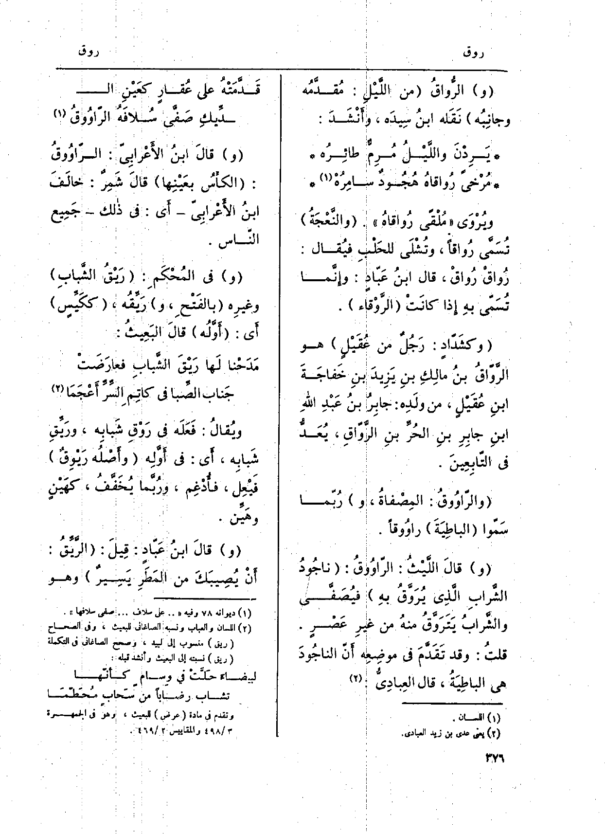 (و) {الرُّواقُ من اللَّيْلِ: مُقدَّمُه وجانِبُه نَقَله ابنُ سِيدَه، وأَنْشَدَ: يَرِدْنَ واللَّيْلُ مُرِمٌّ طائِرُه مُرْخىً} رُواقاهُ هُجُودٌ سامِرُهْ ويُرْوَى مُلْقًى رُواقاهُ. والنَّعْجَةُ تُسَمى {رُواقاً، وتُشْلَى للحَلْبِ فيُقال:} رُواقْ {رُواقْ، قَالَ ابنُ عَبّادٍ: وإِنَّما تسَمّى بهِ إِذا كانَتْ} الرَّوْقاء. وكشَدّادٍ: رَجُلٌ من عُقَيْلٍ هُوَ {الرَّوّاقُ بنُ مالِكِ بنِ يَزِيدَ بنِ) خَفاجَةَ ابنِ عُقَيْل، من ولَدِه: جابِرُ بنُ عَبْدِ اللهِ ابنِ جابِرِ بنِ الحُرِّ بنِ الرَّوّاقِ، يُعَد فِي التّابِعِينَ.