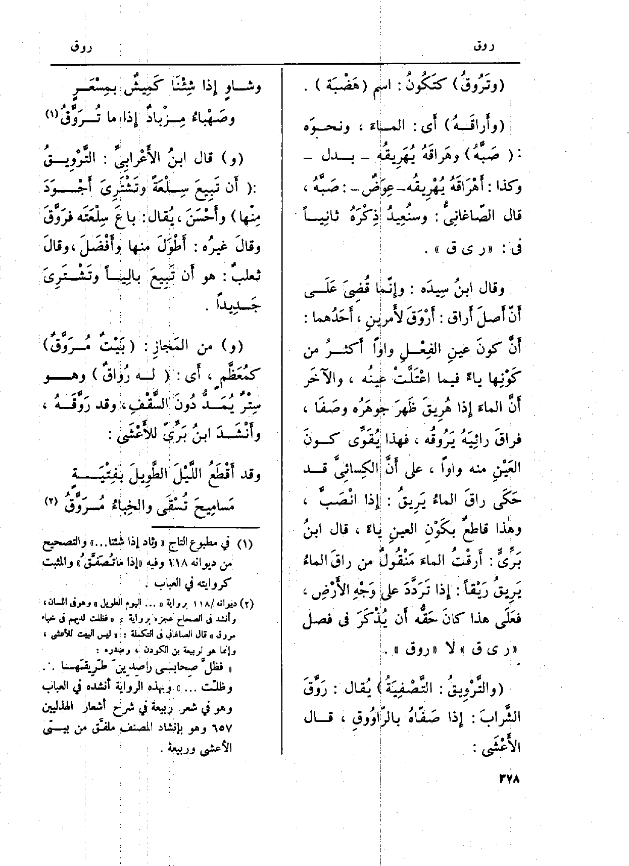} وأراقَهُ أَي: المَاء، وَنَحْوه: صَبَّهُ وهَراقَهُ يُهَرِيقُه بدل وَكَذَا: أَهْرَاقَهُ يُهْرِيقُه عِوَضٌ: صَبَّهُ، قَالَ الصّاغانِيُّ: وسنُعِيدُ ذِكْرَهُ ثانِياً فِي: ر ي ق. وَقَالَ ابنُ سِيدَه: وإِنّما قُضِىَ عَلَى أَنّ أَصلَ {أَراق:} أَرْوَقَ لأَمرينِ، أَحَدُهما: أَنَّ كونَ عينِ الفِعْلِ واوًا أَكثرُ من كَوْنِها يَاء فِيمَا اعْتَلَّتْ عينُه، والآَخَر أَنَّ الماءَ إِذا هُرِيقَ ظَهرَ جوهَرُه وصَفَا، فراقَ رائِيَهُ {يَرُوقُه، فَهَذَا يُقَوِّي كونَ العَيْنِ مِنْهُ واوًا، على أَن الكِسائِيَّ قد حَكَى راقَ الماءُ يَرِيقُ: إِذا انْصَبَّ، وَهَذَا قاطعٌ بكوْنِ العينِ يَاء، قَالَ ابنُ بَرِّىٍّ:} أَرقْتُ الماءَ مَنْقُولٌ من {راقَ الماءُ} يَرِيقُ {رَيْقاً: إِذا تَرَدَّدَ على وَجْهِ الأَرْضِ، فعَلَى هَذَا كانَ حَقُّه أَن يُذْكَرَ فِي فصل ر ي ق لَا ر وق.} والتَّرْوِيقُ: التَّصْفِيَةُ يُقال: {رَوقَ الشَّرابَ: إِذا صَفّاهُ} بالرّاوُوقِ، قَالَ الأَعْشَى: