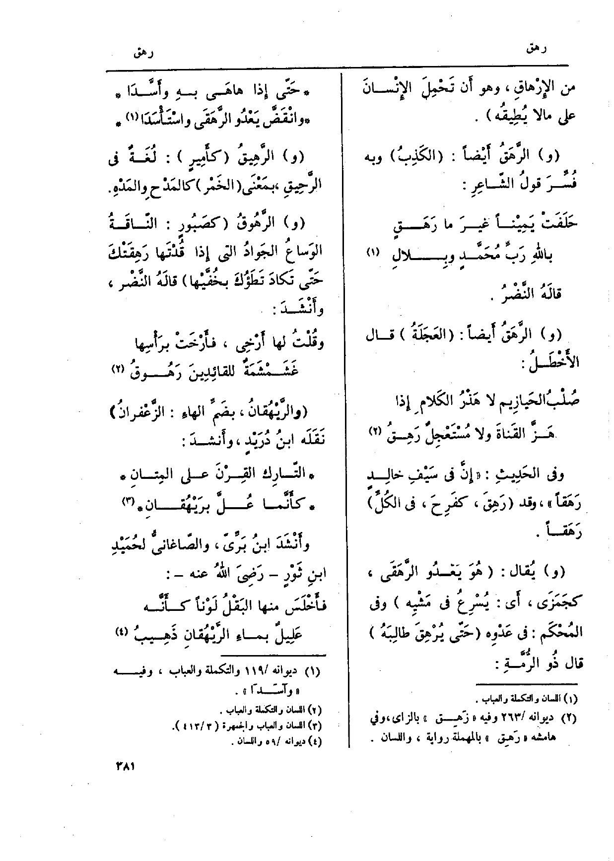 وَفِي الحَدِيثِ: إنَّ فِي سَيْفِ خالِدٍ رَهَقاً، وَقد رَهِقَ، كفَرِحَ، فِي الكلِّ رَهَقاً. ويُقال: هُوَ يَغْدُو الرَّهقَى، كجَمَزَى، أَي: يُسْرِعُ فِي مَشيِه وَفِي المُحْكَم: فِي عَدْوِه حَتّى يُرْهِقَ طالِبَهُ قَالَ ذُو الرمَّةِ: حَتّى إِذا هاهَى بهِ وأَسَّدَا وانْقَضَّ يَعْدُو الرَّهقَى واسْتَأسَدَا والرَّهِيقُ كأَمِيرٍ: لُغَةٌ فِي الرَّحِيقِ، بمَعْنَى الخَمْر كالمَدْح وِالمَدْهِ. والرَّهُوقُ كصَبُورٍ: الناقَةُ الوَساعُ الجَوادُ الَّتِي إِذا قدْتَها رَهِقَتْكَ حَتّى تَكادَ تَطَؤُكَ بخُفيْها قالَهُ النَّضْر، وأَنْشَدَ: