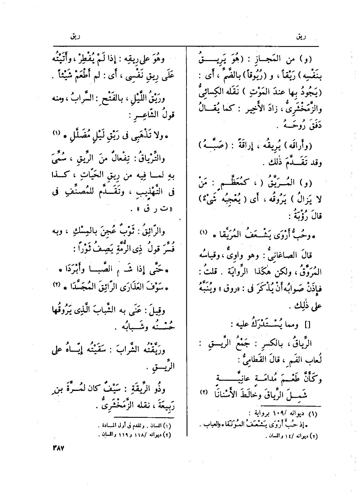 والمُرَيَّقُ، كمُعَظَّم: مَنْ لَا يَزالُ يَرُوقُه، أَي يُعْجِبُه شَيءٌ قالَ رُؤْبَةُ: وحُبُّ أَرْوَى يَشْعَفُ المُرَيَّقا قالَ الصاغانِيُّ: وَهُوَ واوِيٌّ، وقياسُه المُرَوَّقُ، وَلَكِن هكَذا الرِّوايَة. قلتُ: فإِذَنْ صَوابُه أَنْ يُذْكَرَ فِي: روق ويُنَبَّهُ على ذلِك. وَمِمَّا يُسْتَدرَكُ عَلَيْهِ: {الرِّياقُ، بالكسرِ: جَمْعُ} الرِّيقِ لُعاب الفَم، قالَ القَطامِيُّ: