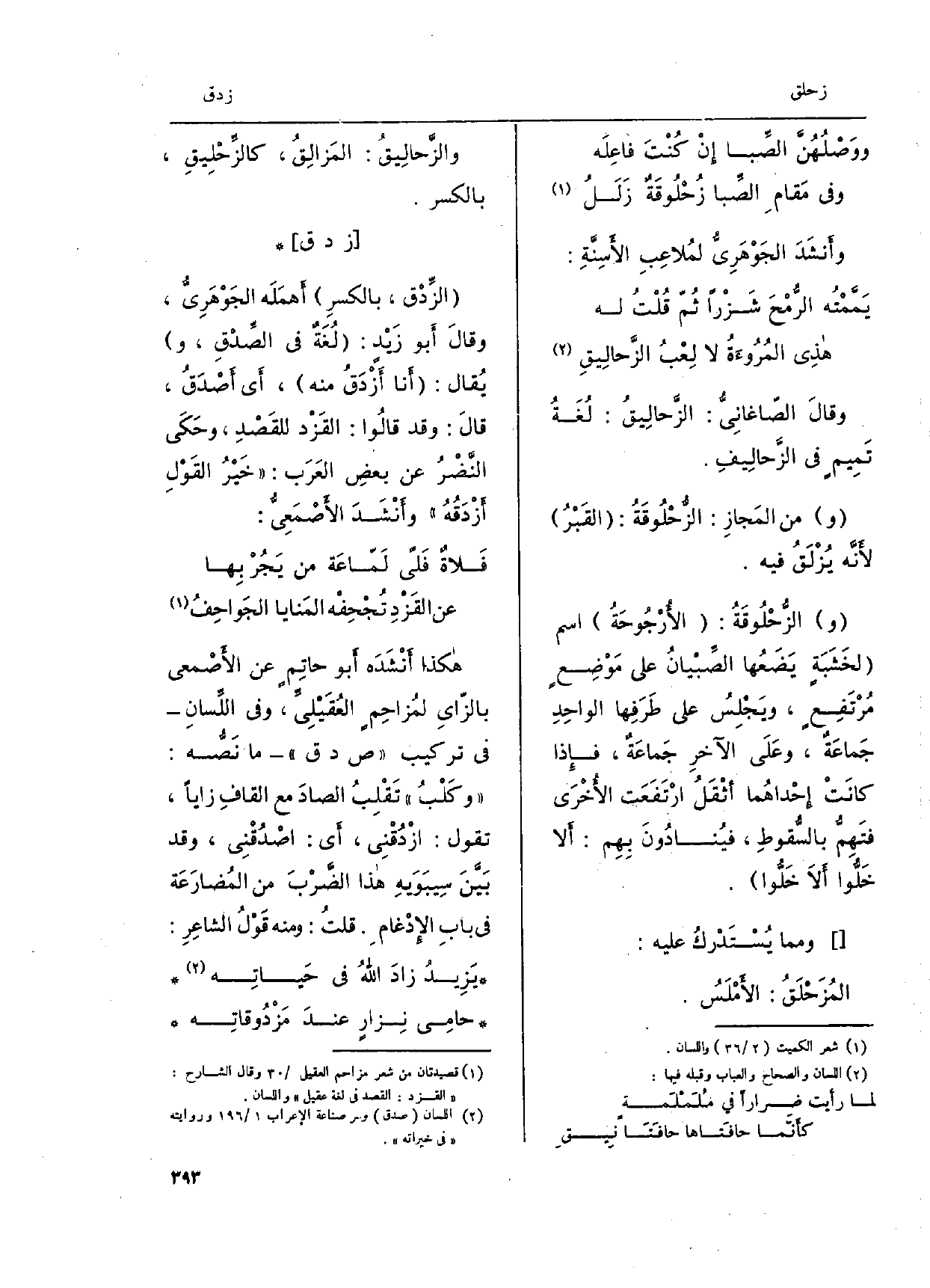 هَكَذَا أَنْشَدَه أَبُو حاتِم عَن الأَصْمعي بالزّاىِ لمُزاحِم العُقَيْلِيِّ، وَفِي اللِّسانِ فِي تركيب ص د ق مَا نَصُّه: وكَلْبُ تَقْلِبُ الصادَ مَعَ القافِ زاياً، تَقول: ازْدُقْنِي، أَي: اصْدُقنِي، وَقد بَيَّنَ سِيبَوَيهِ هَذَا الضَّرْبَ من المُضارَعَة فِي بابِ الإدْغام. قلتُ: وَمِنْه قَوْلُ الشاعِرِ: يَزِيدُ زادَ اللهُ فِي حَياتِه حامِي نِزارٍ عندَ مَزْدُوقاتِه